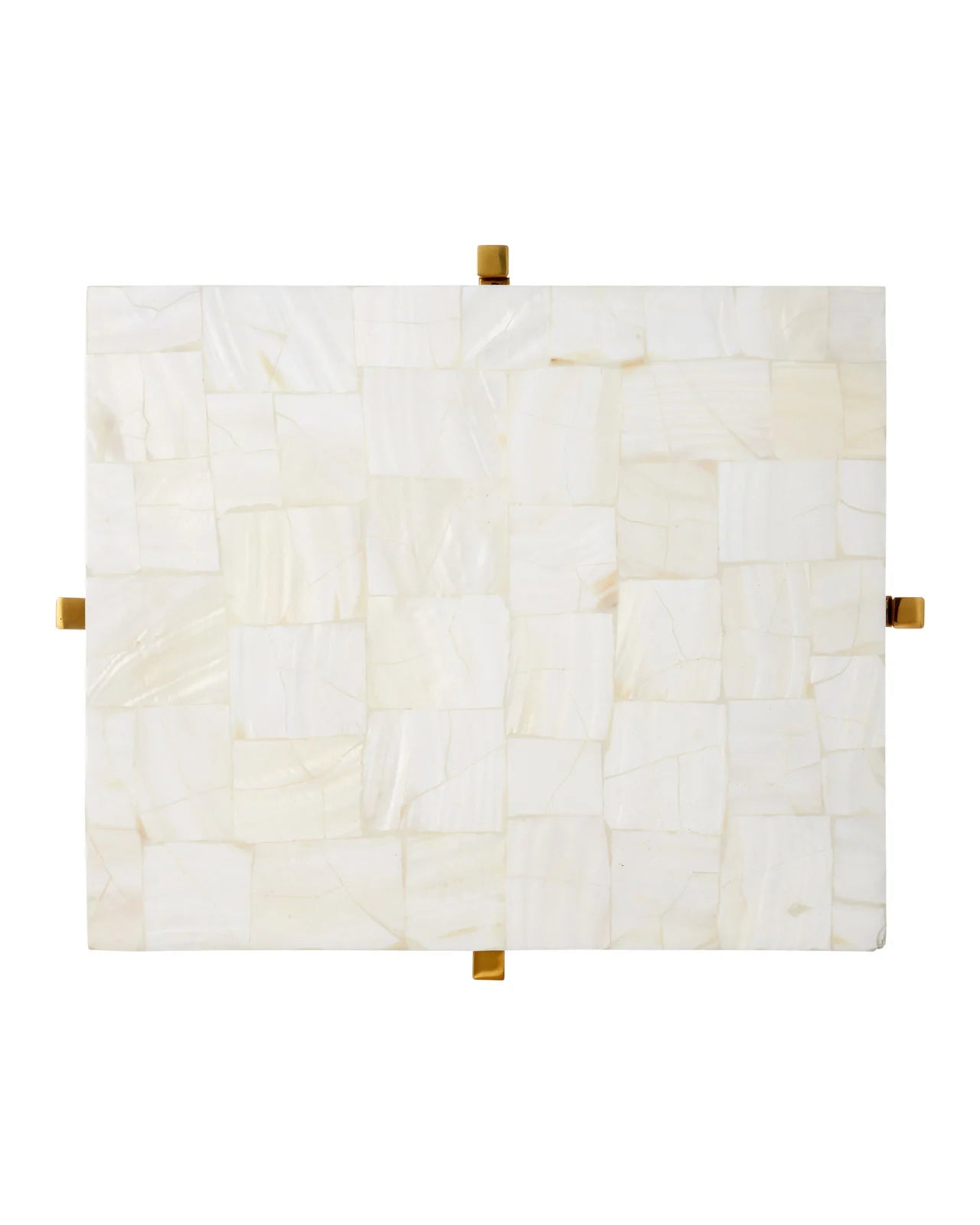 • The luxe feel of a timeless material make the Casey Mother of Pearl Accent Table a striking display of fine artisanship. The top is covered in a mosaic of shells that were expertly placed to cover the rectangular slab, which is inset into the metal frame like a gem. Four legs made of stainless steel in a warm brass finish are connected by an ex-shaped stretcher. The gold and ivory drinks table will bring radiant charm to any spot even though it’s small.