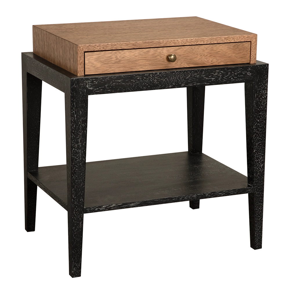 • This small side table has a Black Walnut finished base and Dark Walnut top for a modern look. With brass hardware and an open shelf, it provides practical storage and is a stylish choice for transitional interiors.