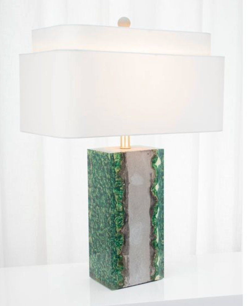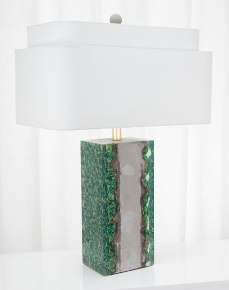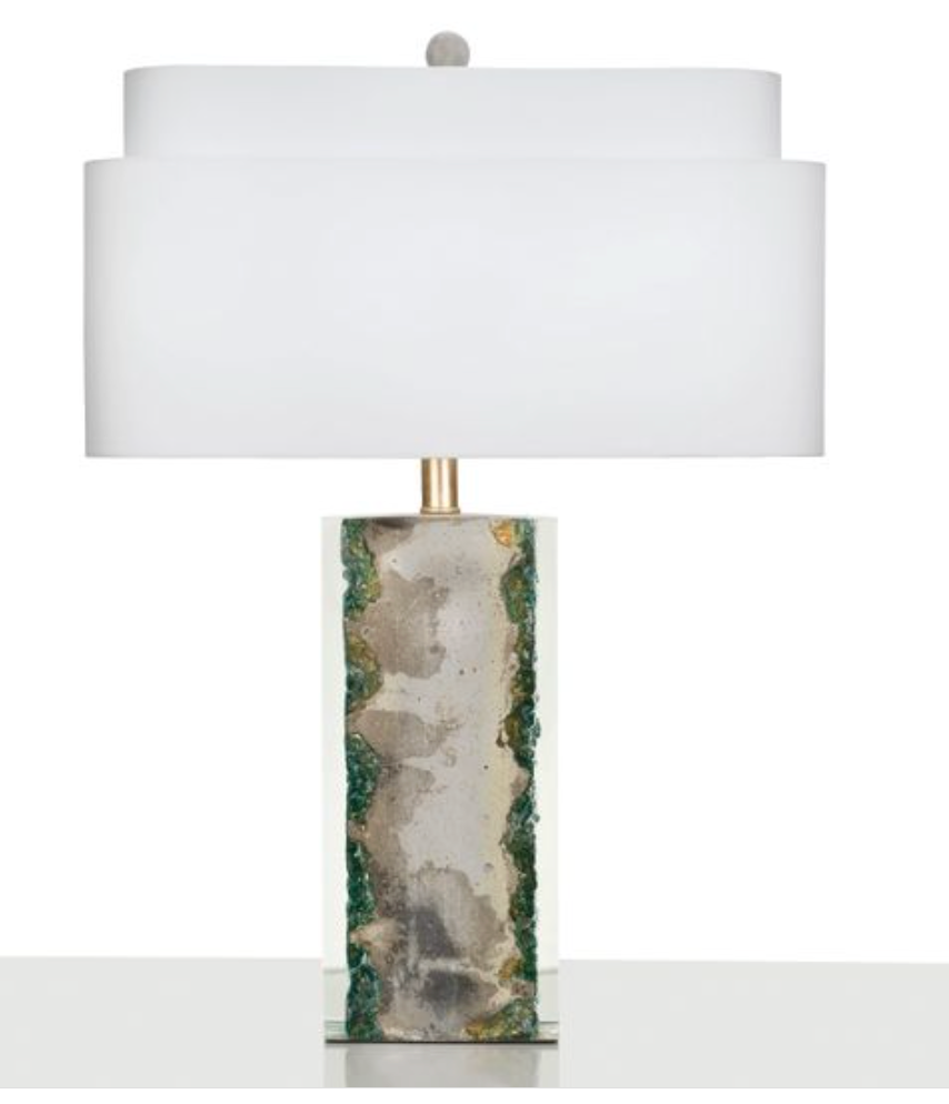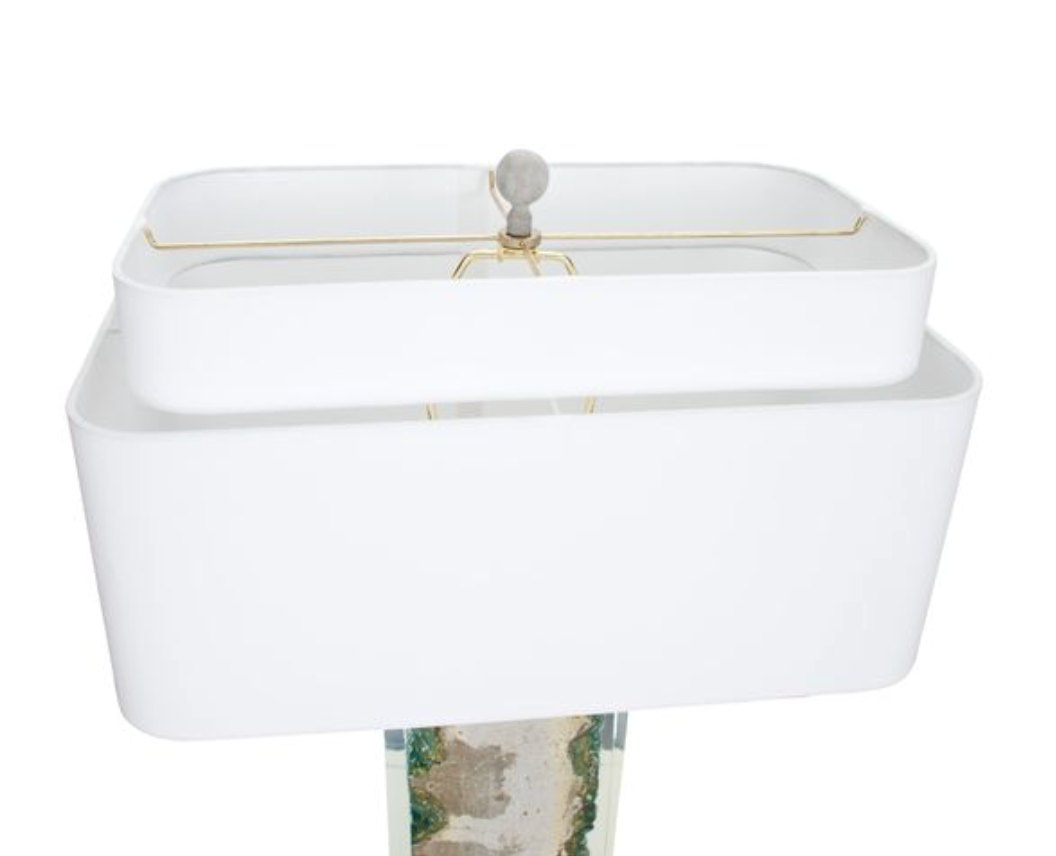 We have taken a cement column, chipped away at the edges. Then covered the chipped edges with gold leaf...leaving them to oxidize. Once complete - we place in a mold with clear resin. Creating an individual work of art, where no two will be alike. Topped with a double layer rectangular hardback in white linen. Artisan-crafted in Vietnam, exclusively for Couture.