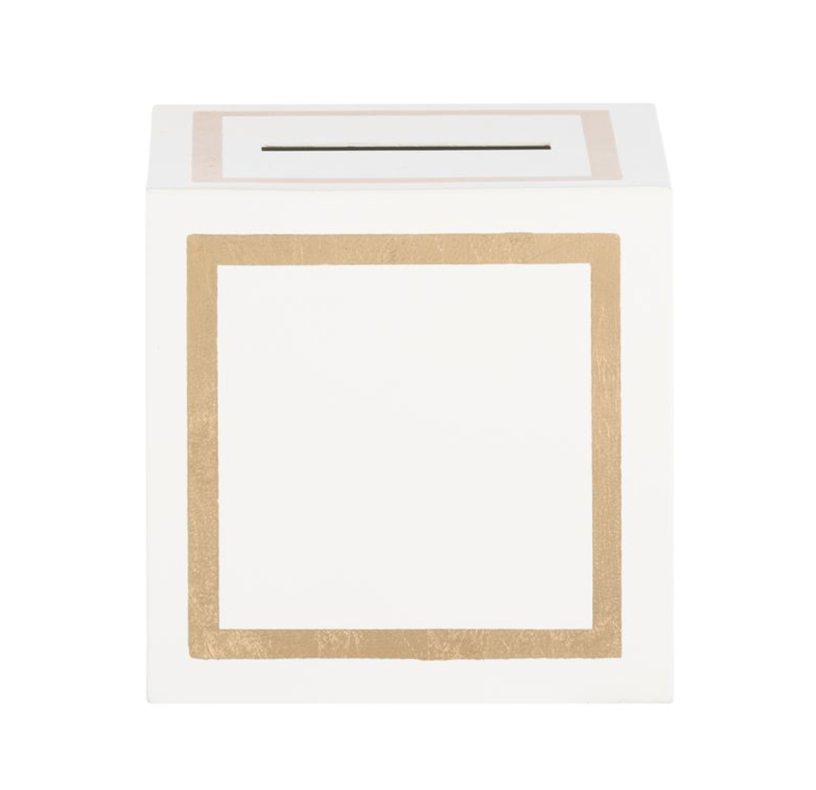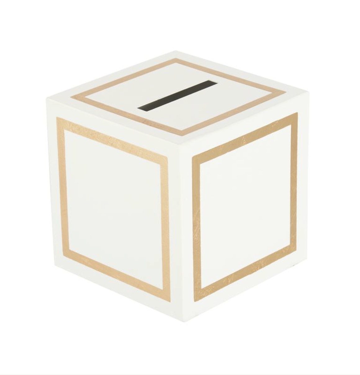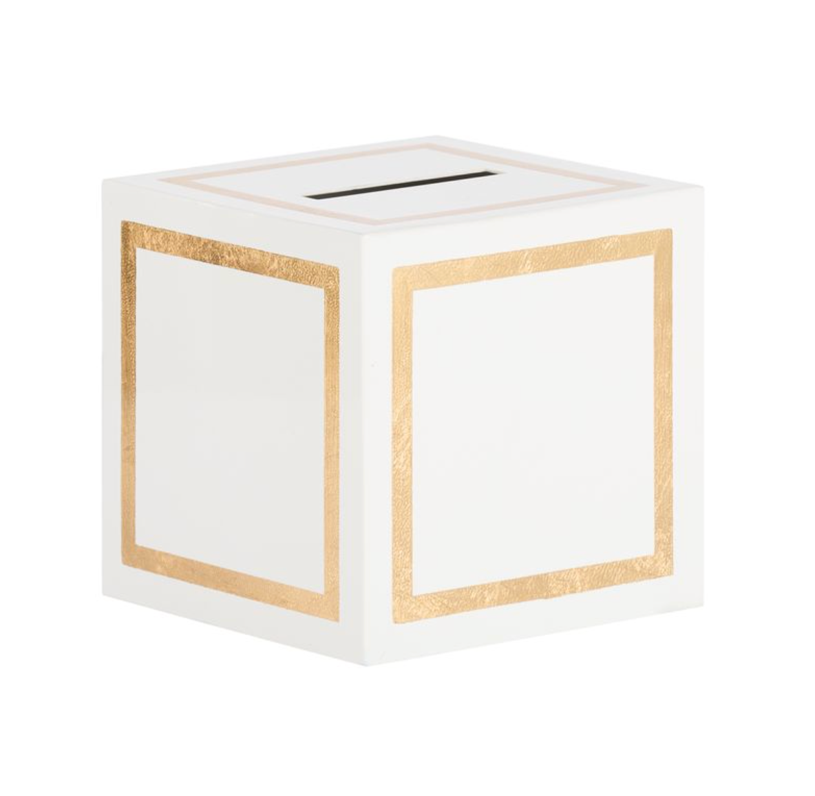 • Metal tissue box cover in cream with metallic gold or silver trim. Designed by Claire Bell.