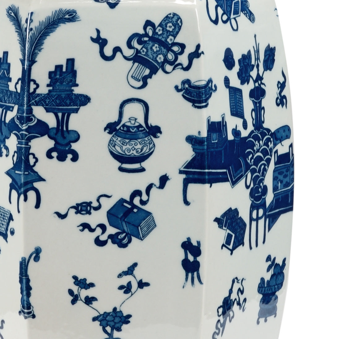 • White glazed ceramic with hand-painted blue designs.