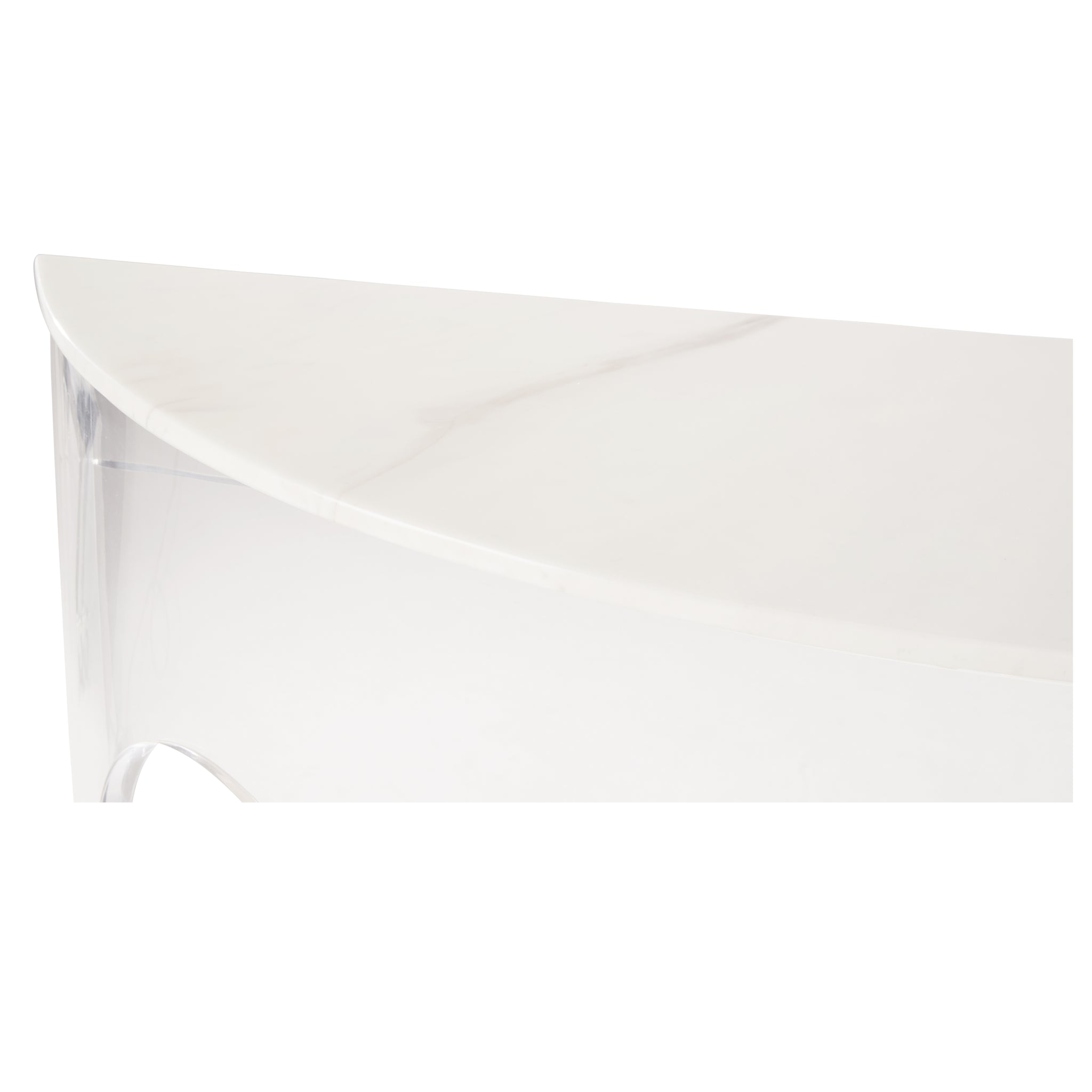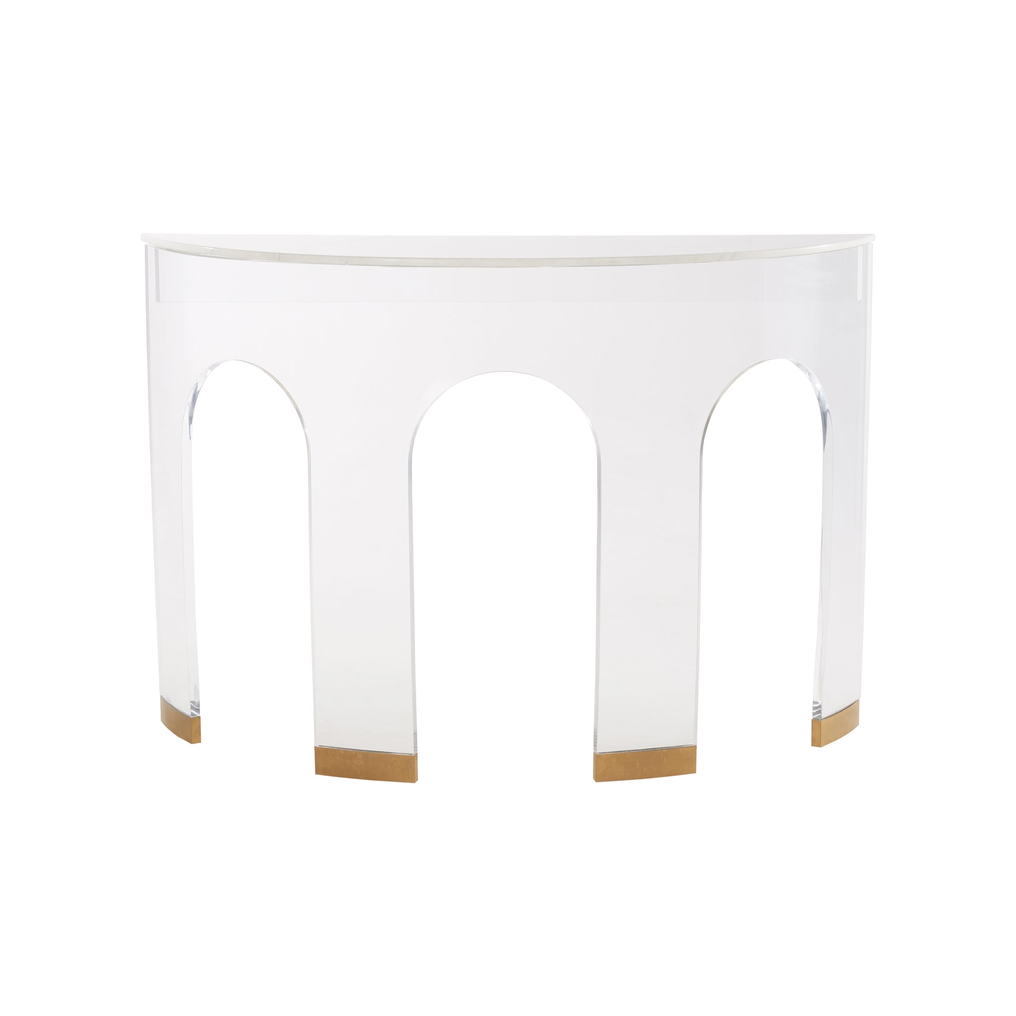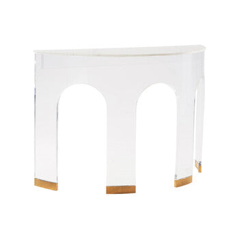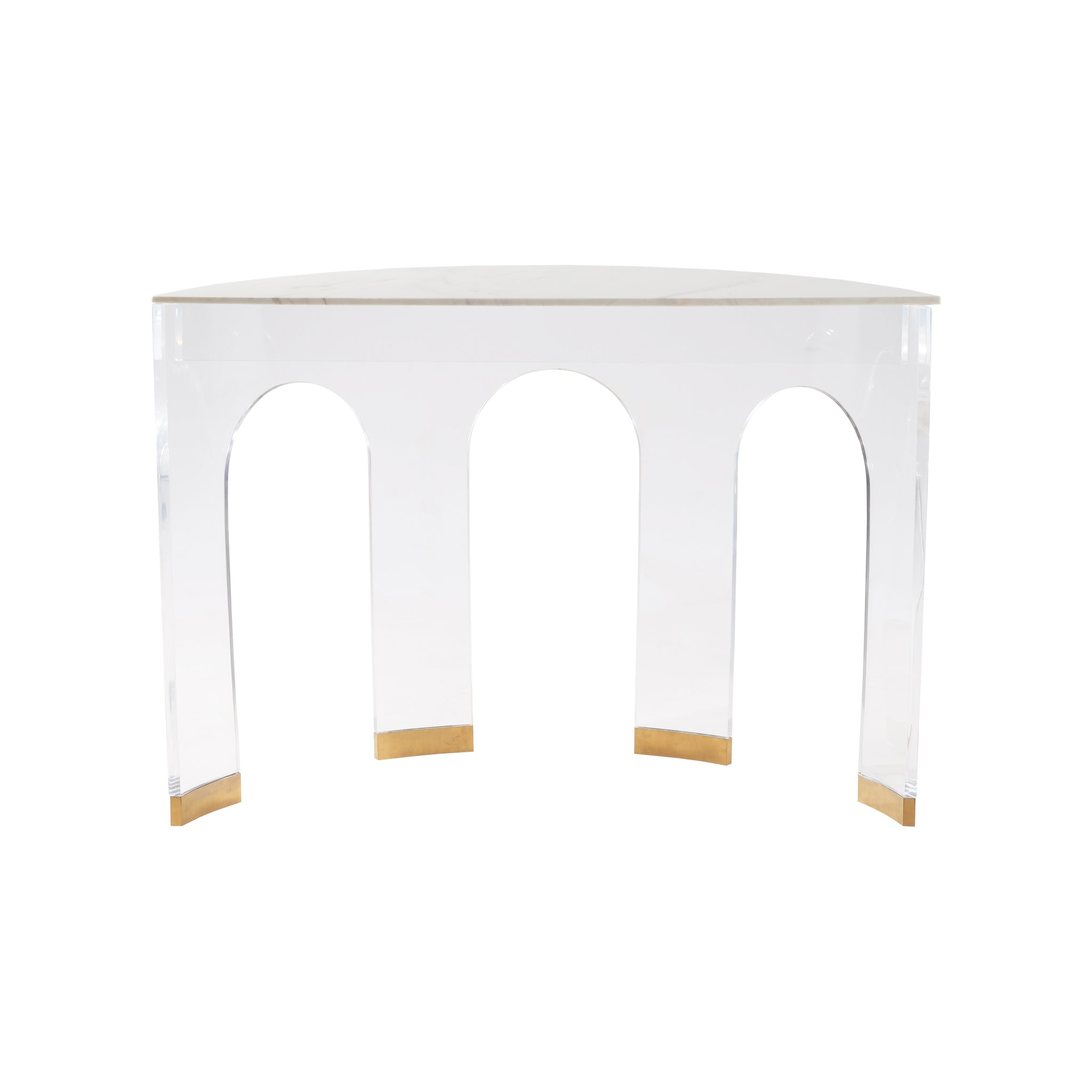 • This striking demilune table pairs a sleek acrylic base with graceful arched legs, brass bands and a polished marble top. The blend of modern transparency and classic materials creates a sophisticated, airy look perfect for entryways or accent spaces. Designed by Elizabeth Wicker.