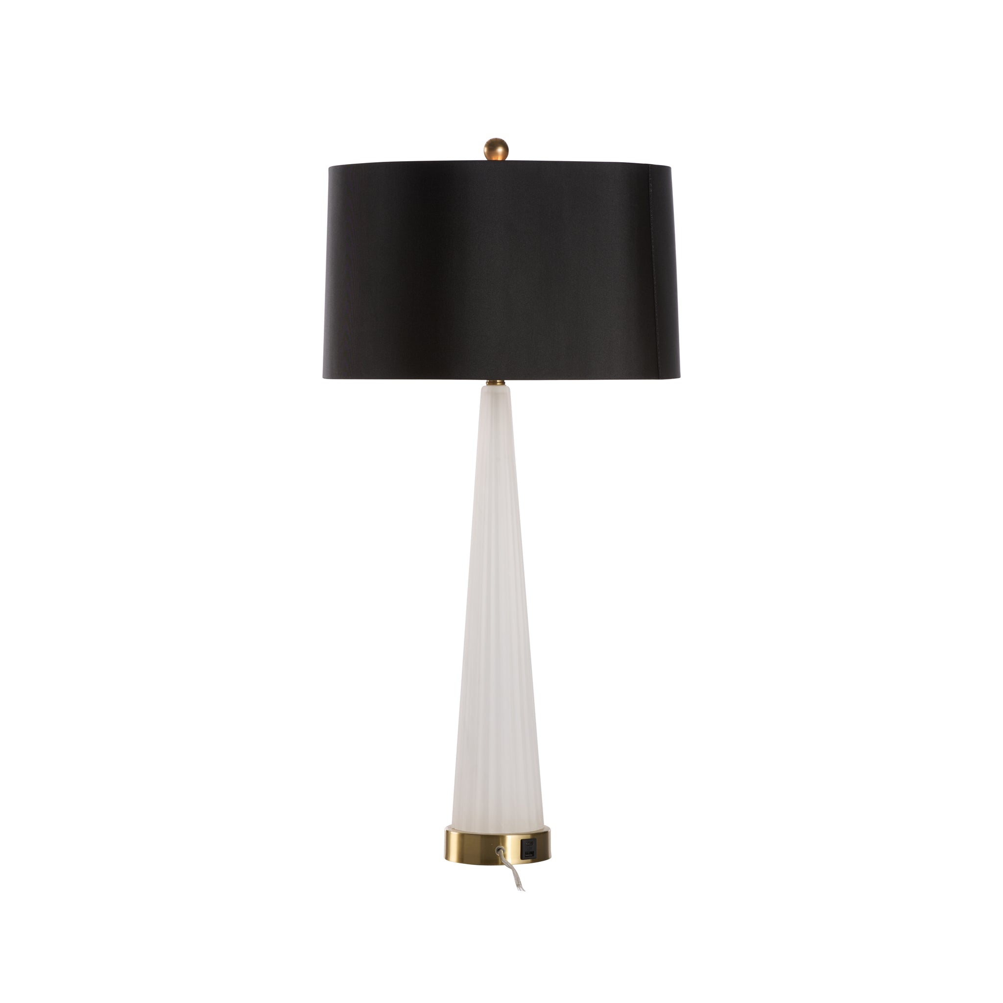 • The Ava Lamp features a fluted glass body in a crisp, tapered silhouette, anchored by a polished brass base and topped with a bold black shade. Equipped with a built-in USB port, it effortlessly blends elegance and modern functionality.