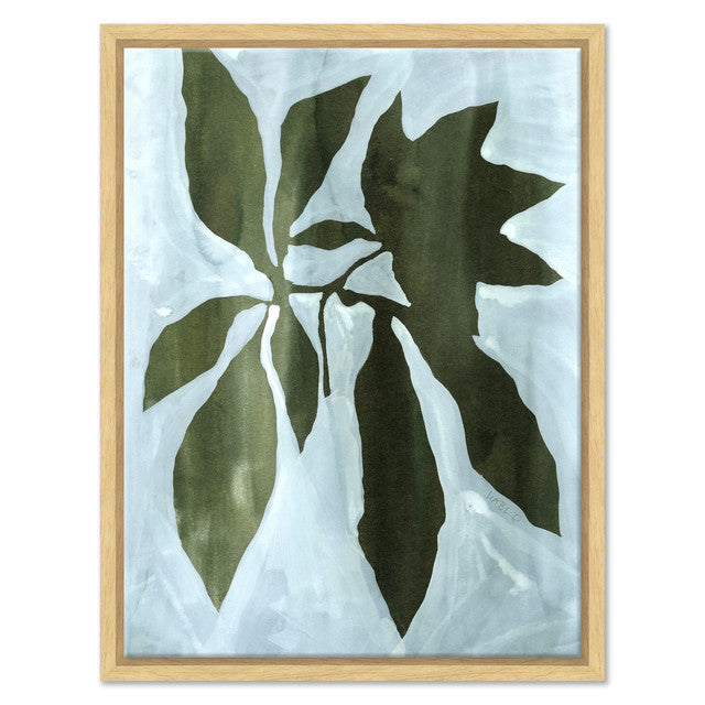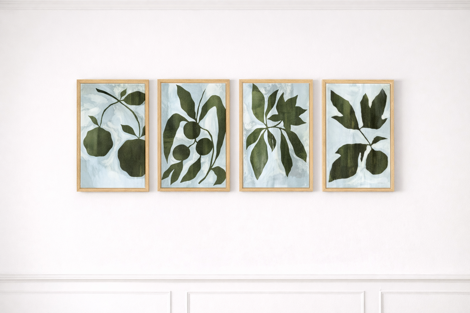 This modern botanical quartet brings a fresh, calming energy to any space through its bold simplicity and painterly texture. Each canvas features softly layered washes of pale blue and white, overlaid with deep green botanical silhouettes that feel both organic and graphic—creating a look that is equal parts coastal, contemporary, and timeless.