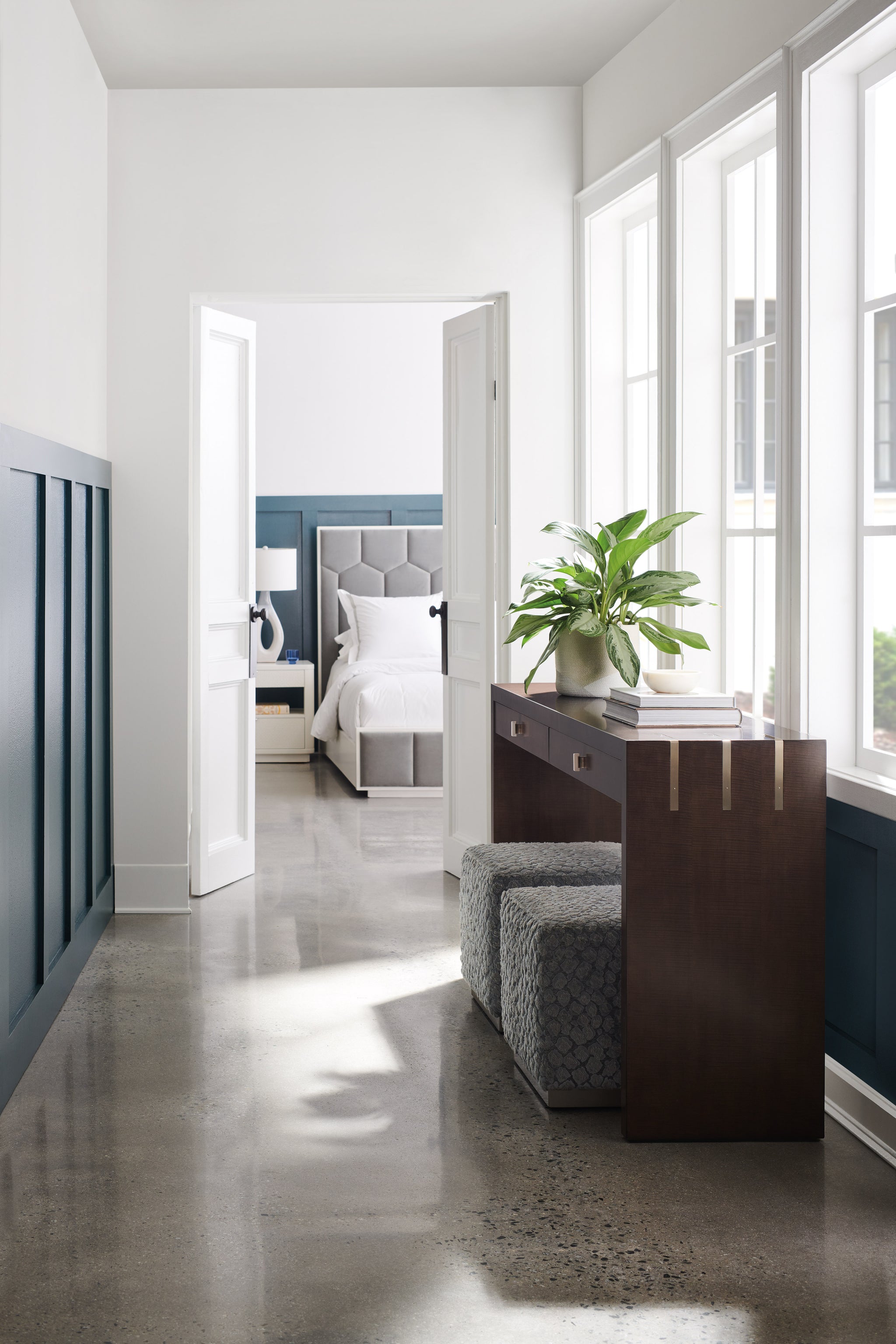 Rounded edges soften this clean-lined bedside table, quietly captivating in a Cloud White finish. Carved drawer fronts add tactile appeal with a woven mini-tile motif, accentuated by finger-cup pulls in Satin Nickel. Features two drawers and open center storage with a built-in light. A USB port and cutouts in the back let you charge devices and keep cords out of sight.
