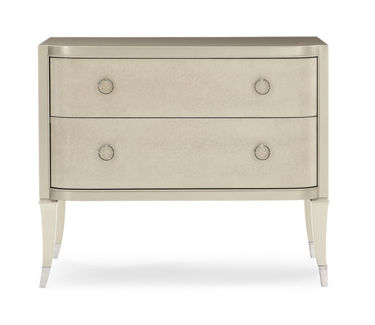 With effortless elegance, this sophisticated nightstand makes the perfect mate for any stylish bed. Designed to keep nighttime essentials close at hand, it wears a Soft Silver Paint finish and offers two drawers with painted interiors in the same soothing hue. Each drawer face is accentuated by an exquisite Smoked Birdseye finish complemented by shimmering, jewelry-like ring pulls while metal ferrules in Polished Stainless Steel cap its gently curved legs.