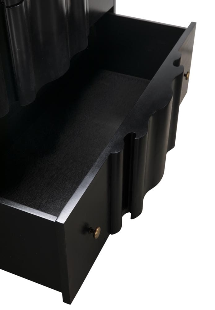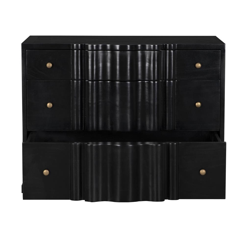 • The Kiss Dresser in Hand Rubbed Black is a perfect blend of modern sophistication and classic design. Made from mahogany and veneer, its rich black finish is achieved through a meticulous hand-rubbing process that highlights the wood’s natural beauty and texture. The dresser is accented with elegant brass pulls, adding a touch of luxury to its sleek design.