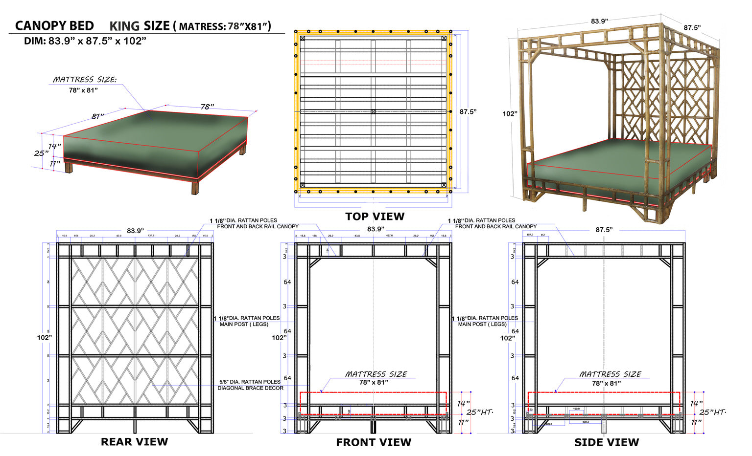 Amanda says, "Go tall or go home." This spectacular bed is the Grande Dame of her collection – a true statement piece. She designed her Paradise Bed with a lofty 8.5-foot canopy for maximum drama and romance. The fabulous fretwork frame is handcrafted of naturally strong pole rattan. Unlike vintage canopy beds requiring a separate interior frame to hold your mattress, ours includes teak slats to accommodate a mattress.  Recommended weight limit for bed is 550lbs. Available in both queen and king sizes.