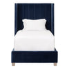 • Revitalize your bedroom aesthetic with the Chandler Twin Bed by Essentials For Living. This transitional-style bed, meticulously crafted with velvet upholstery and solid oak finishes, seamlessly marries elegance and style. The denim velvet upholstery, composed of 89.1% cotton and 10.9% polyester, showcases eye-catching vertical channel stitching and precise edge piping detail, elevating its sophistication. The wing headboard design imparts a snug and chic atmosphere, complemented by solid natural gray oak legs for unwavering support. Measuring 49" wide, 82.5" deep, and 62.5" high, this bed is ideal for smaller spaces, guest bedrooms, and children's rooms. This bed also conveniently features a removable European metal slat system that allows for customization. This luxurious and richly colored bed will surely enhance any room it graces, creating a serene sleeping environment.