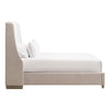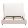 • Elevate your bedroom with the sophisticated Sloan Cal King Bed by Essentials For Living. The transitional design showcases an upholstered frame with LiveSmart Peyton Pearl fabric on the interior of the headboard and Bisque fabric on the rails, footboard, and outer headboard. The contrasting white and beige materials create a luxurious and inviting atmosphere. The edge piping detail and arched headboard design with sloped wings add visual appeal as well. The headboard's interior boasts high-performance fabric that is easy to clean, while the exterior, footboard, and rails are adorned with an earthy linen blend. The exposed feet are made of solid oak wood with a natural gray finish. It measures 83" wide, 92" deep, and 59" high, and includes a removable metal frame European slat system for added convenience.