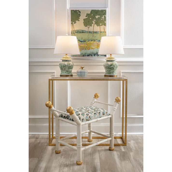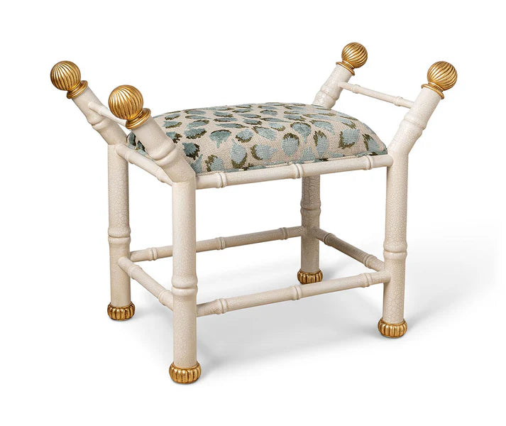 Boca is Port 68's Hollywood regency style bench with features a bamboo frame and contrast metal gold leaf fluted finials and feet.  Cast steel metal frame is available in black crackle and cream/white crackled finishes. We offer a range of fabrics.