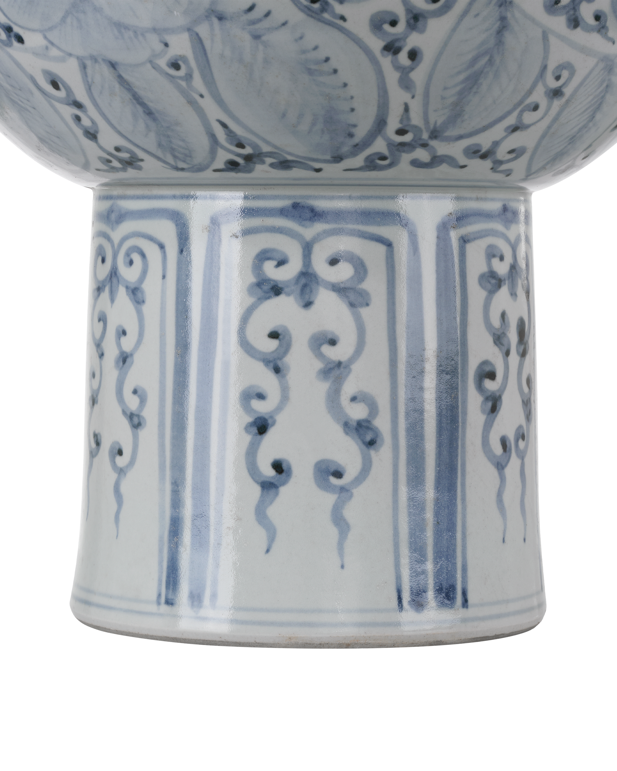 • The Ming Offering Pedestal Bowl is made of hand-painted porcelain in a classic blue and white pattern. The elegant piece features intricate floral and geometric motifs that honor the refined artistry of the Ming dynasty. The bowl rests on a graceful pedestal that elevates it to make it a perfect centerpiece. Whether it is filled with fruits or decorative accents or simply left empty to be admired as a work of art, it will radiate beauty. Because it is hand-painted, patterns will vary slightly on each piece.