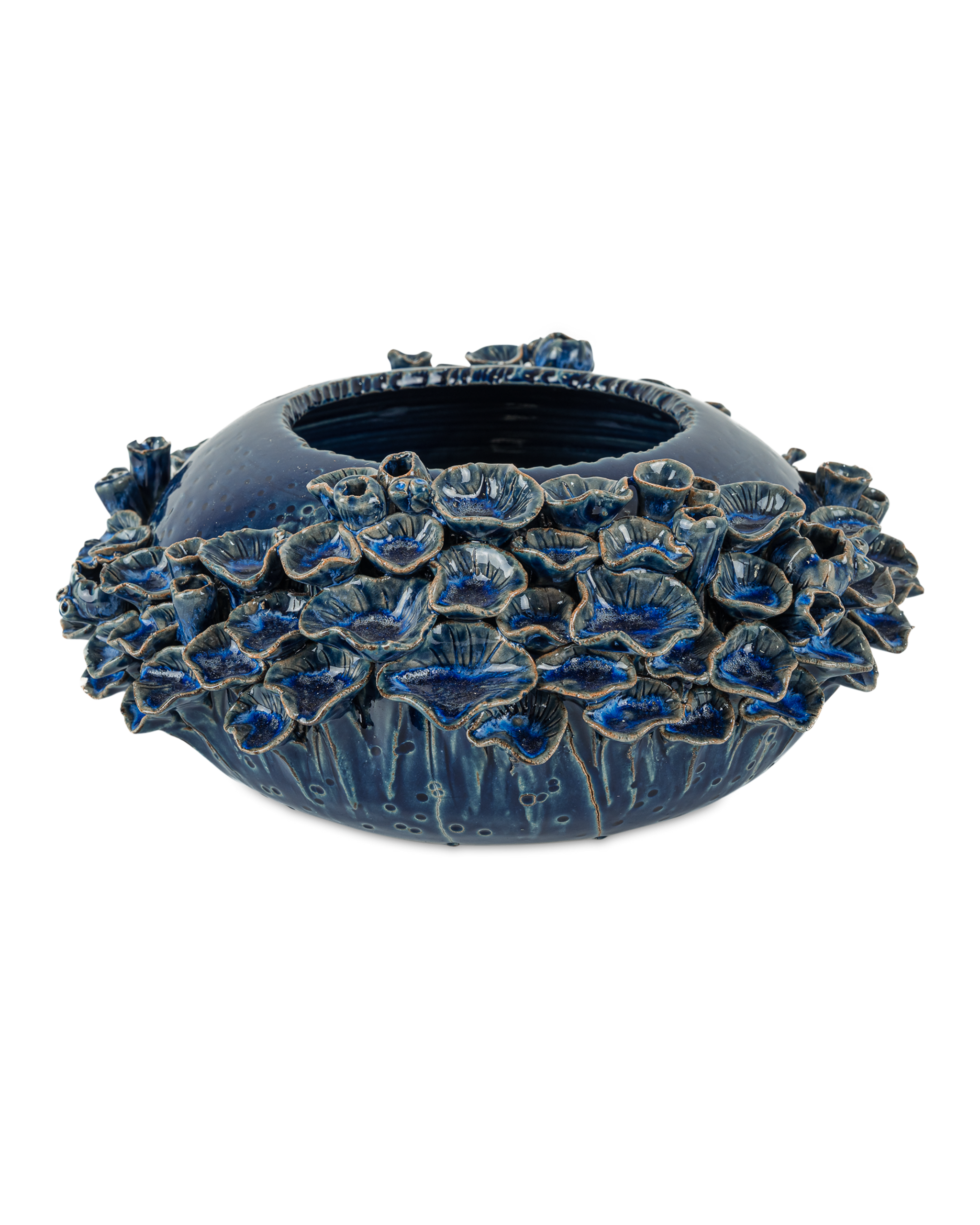 • The Sunken Blue Bowl is a decorative accessory made of dark clay ceramic ornamented with sea life flowing up from its bottom. The piece is thrown and carved before the dark blue reactive glaze is applied, a lighter blue falling glaze accentuating the tops of the ornamentations to make each vessel unique. The Sunken Blue Bowl is also glazed on the interior but it is not watertight so it requires a liner for floral arrangements.