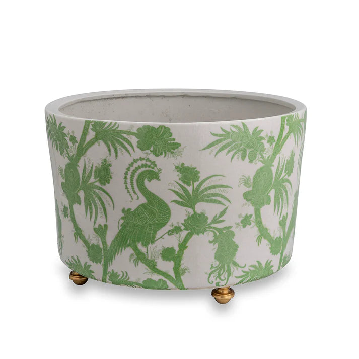 Balinese peacock is inspired by a nineteenth century archival French wallpaper roller print. Decidedly a South Seas look, the Scalamandre' green on white pattern is rendered in exotic motifs of fruit, foliage and peacocks with delicate batik-like details.  Part of the Scalamandre' Maison by PORT 68 collection, the center basin planter is made of porcelain with solid brass metal feet.