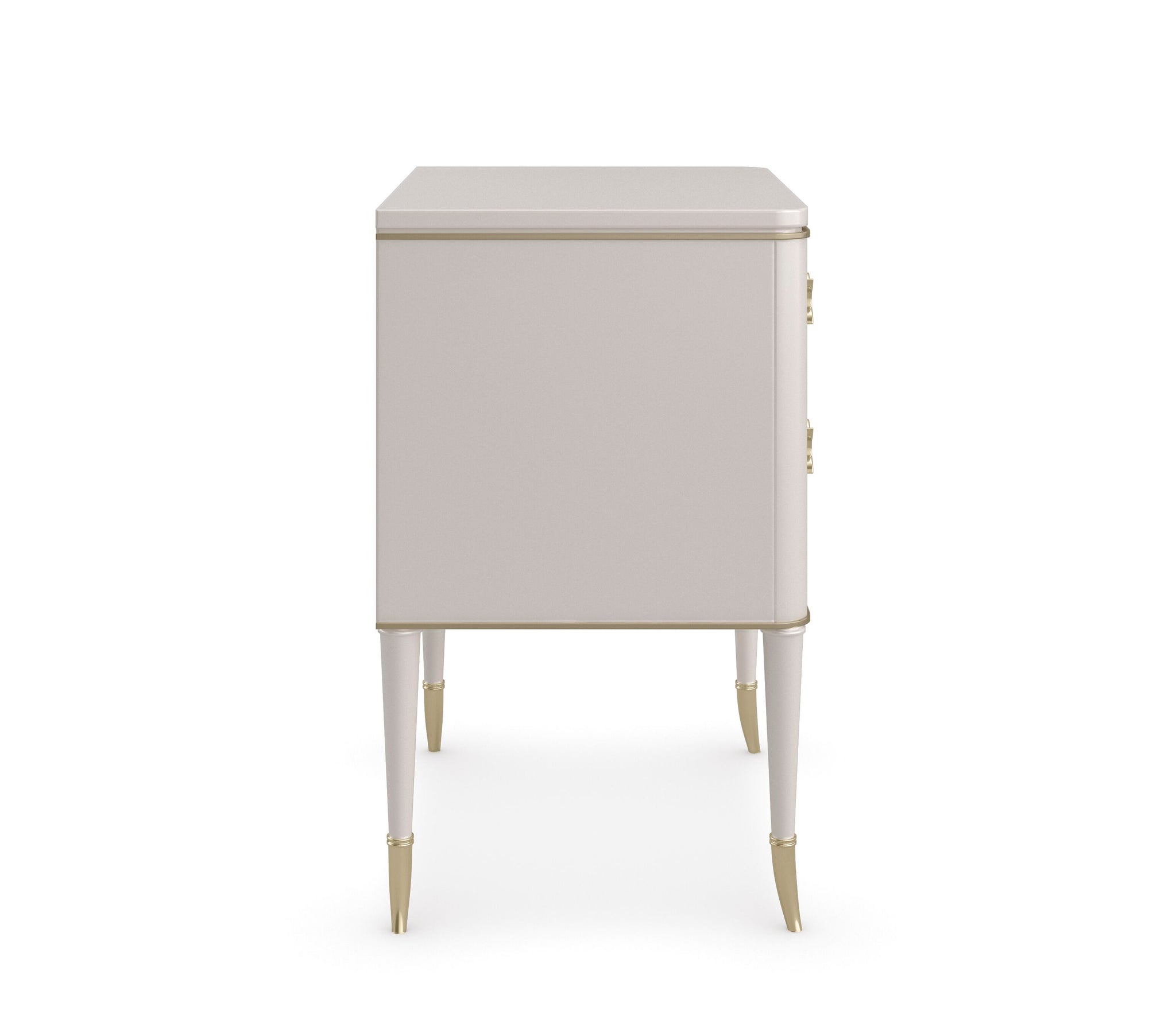 • A shining example of attention to detail and materials, this nightstand offers elegant bedside storage with a hint of glitz. Encased in a shimmering Stardust finish, it features drawer fronts in a silver-dyed Madrona burl with cloud-like swirls, warmly complemented by soft gold tones and striped beading in a Platinum finish. For a luxe finishing touch: metal ferrules in a Whisper of Gold and a surprise pull-out shelf with a mirrored surface.