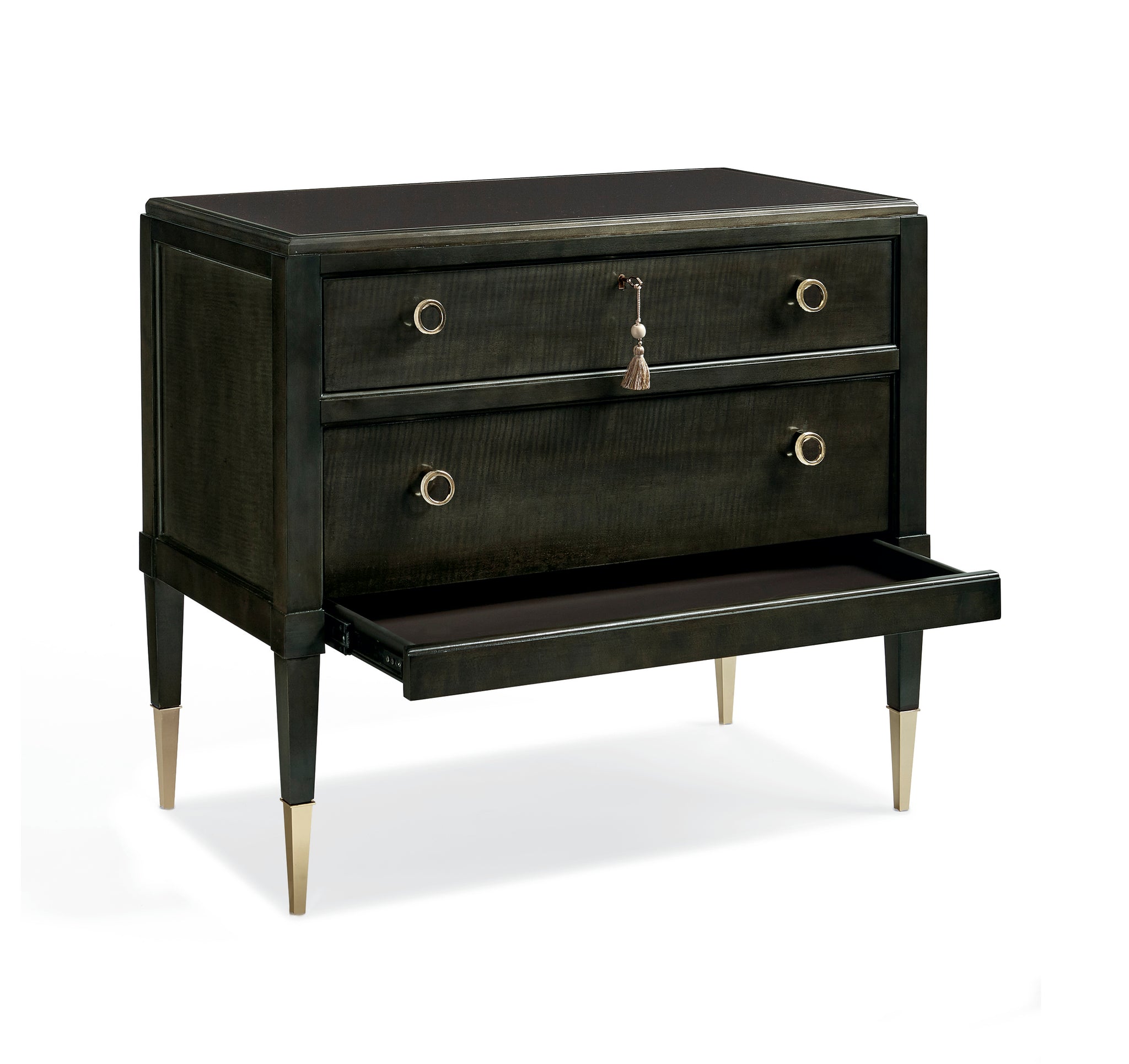 • The clean, linear frame of this Charcoal Anegre nightstand gives off a streamlined air. The piece is punctuated by custom round Whisper of Gold pulls and tapered legs with gold ferrules. A dark glass top sits over three drawers, one of which is hidden for papers and valuables. The top drawer is lined in a taupe/charcoal herringbone pad. The golden key and tassel adds an elegant touch to the locking drawer. It’s a Good Evening indeed when this piece is beside your bed.