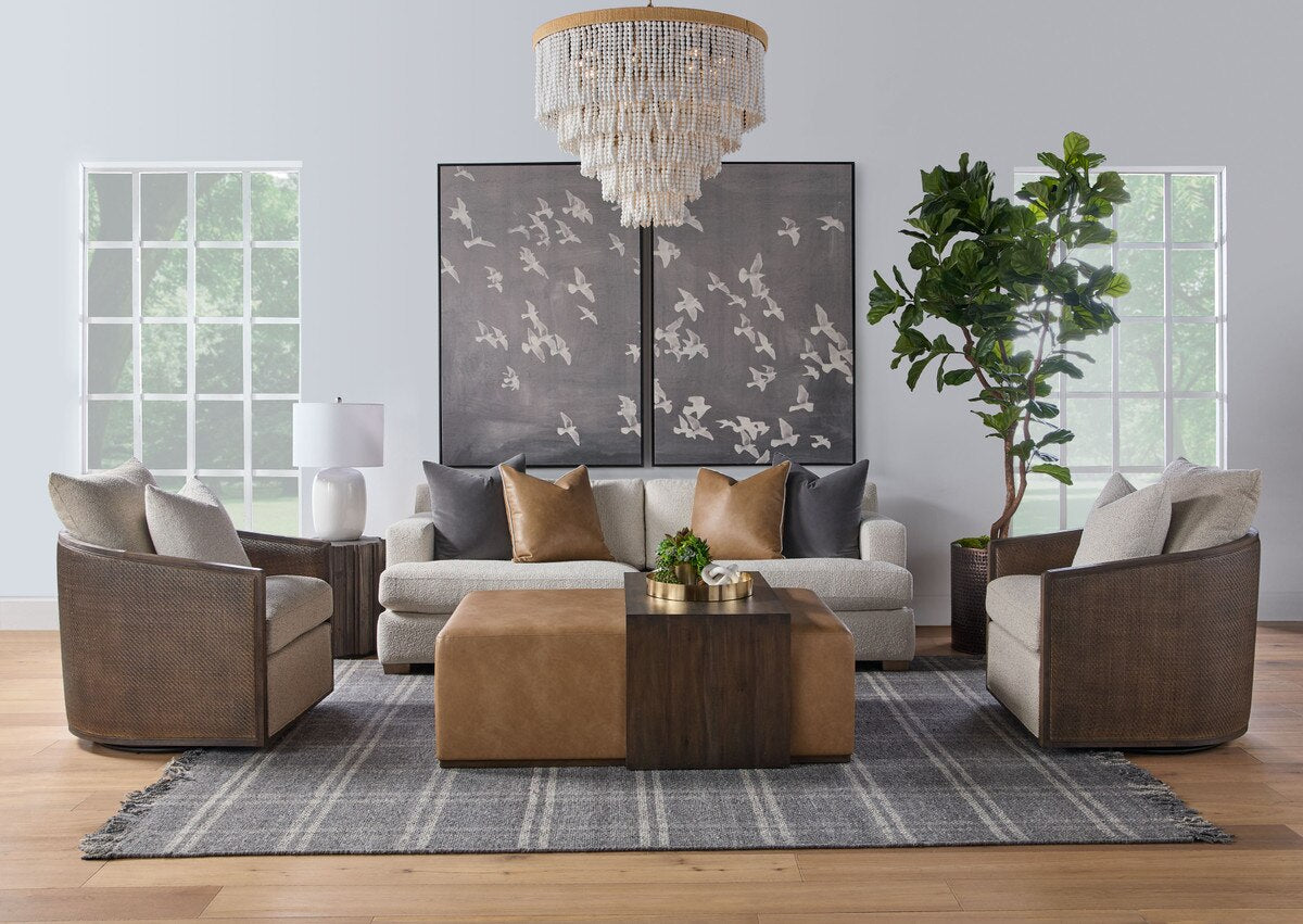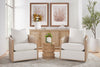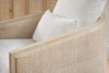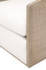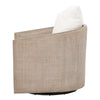 • Enhance your living space with the unique McGuire Swivel Club Chair by Essentials For Living. The bucket-style chair showcases a combination of natural gray cane and oak surround frame with contrasting white textured upholstery. The LiveSmart boucle snow fabric, made from 96% polyester and 4% acrylic, is treated with stain-resistant properties for easy cleaning. It measures 30" wide, 34.25" deep, and 35" high, with a seat height of 17.5". This is crafted from a durable mix of rattan, solid oak wood, and plywood. The 360° swivel metal base offers flexibility and convenience for any seating arrangement. The seat cushion is reversible and removable for even wear. A large square throw pillow is included for added back comfort. Both the pillow and seat cushion are filled with 50% polyester and 50% down feather blend. With its neutral colors and distinct style, you can effortlessly transform any transitional style room by adding this one-of-a-kind swivel chair to your collection.