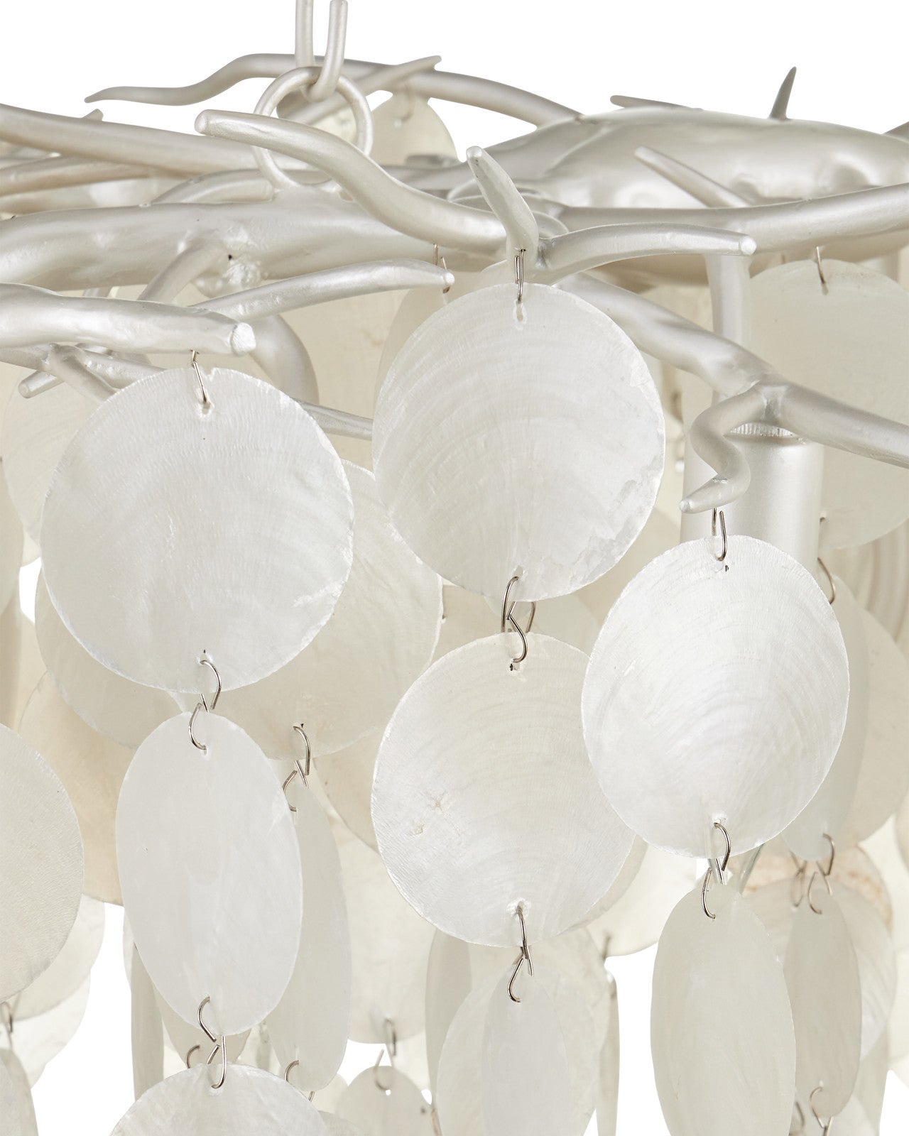 • The Lusso Chandelier features hand-cut capiz shell discs that cascade from a hand-forged wrought iron frame shaped like tapering stems. The shells gradually decrease in size as they flow downward in a staggered arrangement, creating a soft, layered effect. A pearlized white finish on the frame complements the natural luster of the shells. Adjustable from 30" to 88" with use of included chain/rod kit/cable. If your space calls for a longer drop, additional chain/rods/cable is available for purchase.
