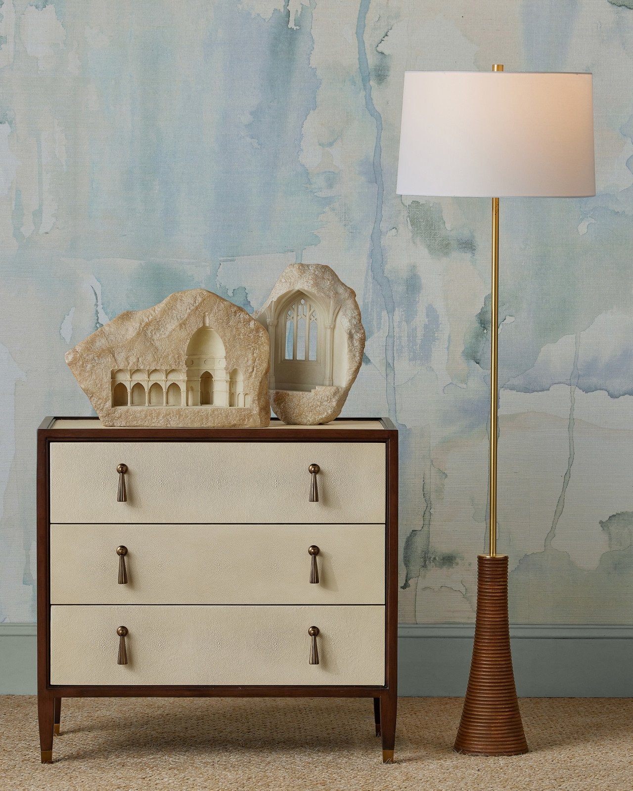 • Antique brass edges and veining with smooth off-white composite interiors for art deco feel.