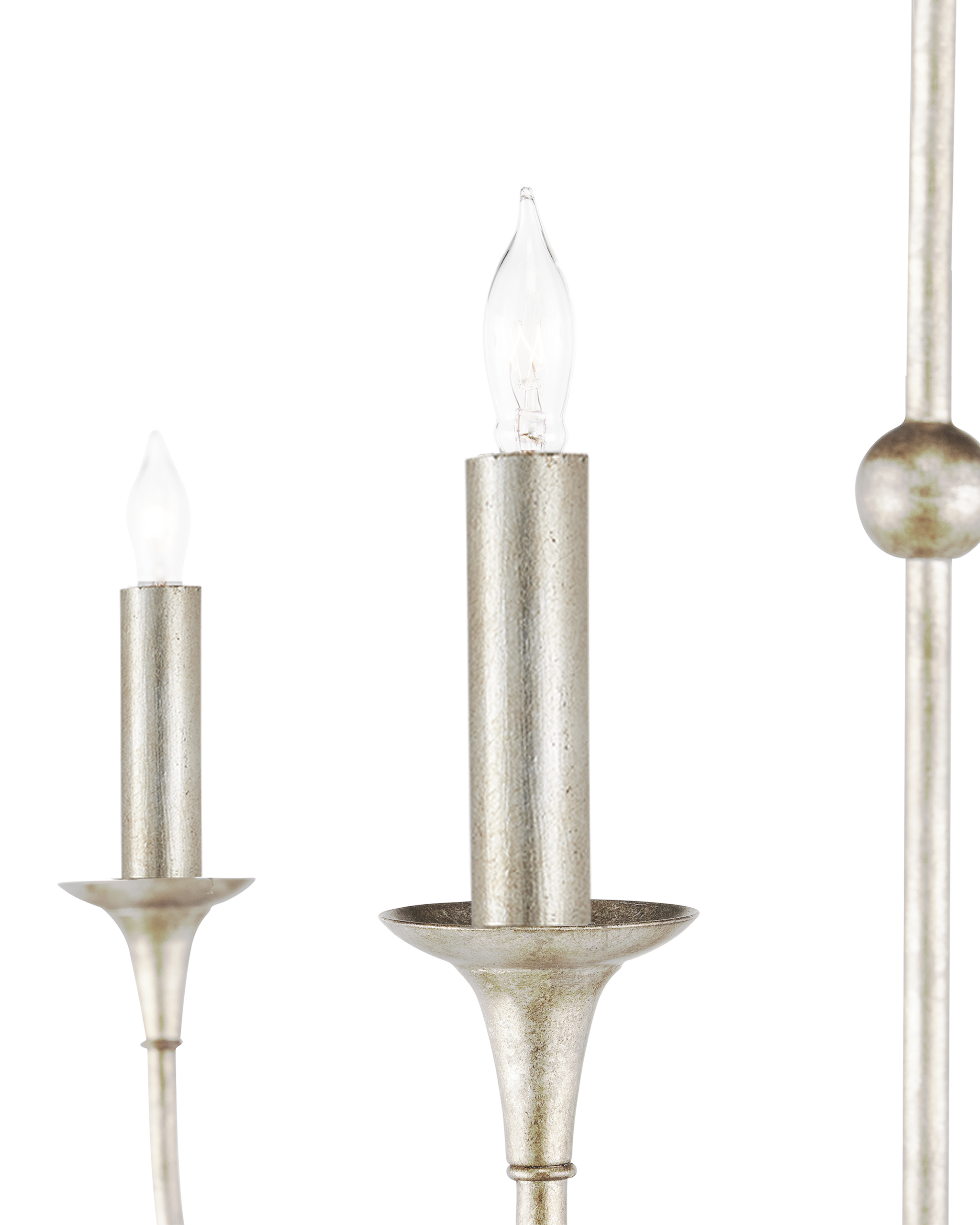 • The arms of the Nottaway Grande Champagne Chandelier stretch gracefully from petite cogs that rest at three points on its long, thin stem, the bottom one ornamented with a dainty ring. Though the silver chandelier has minimalist lines, there is a sweeping fluidity to its profile that makes it a natural choice for large tall foyers or any room with high ceilings. The finish on the wrought iron frame brings textural interest to this dimmable 18-light fixture. Adjustable from 70" to 138" with use of included chain/rod kit/cable. If your space calls for a longer drop, additional chain/rods/cable is available for purchase.