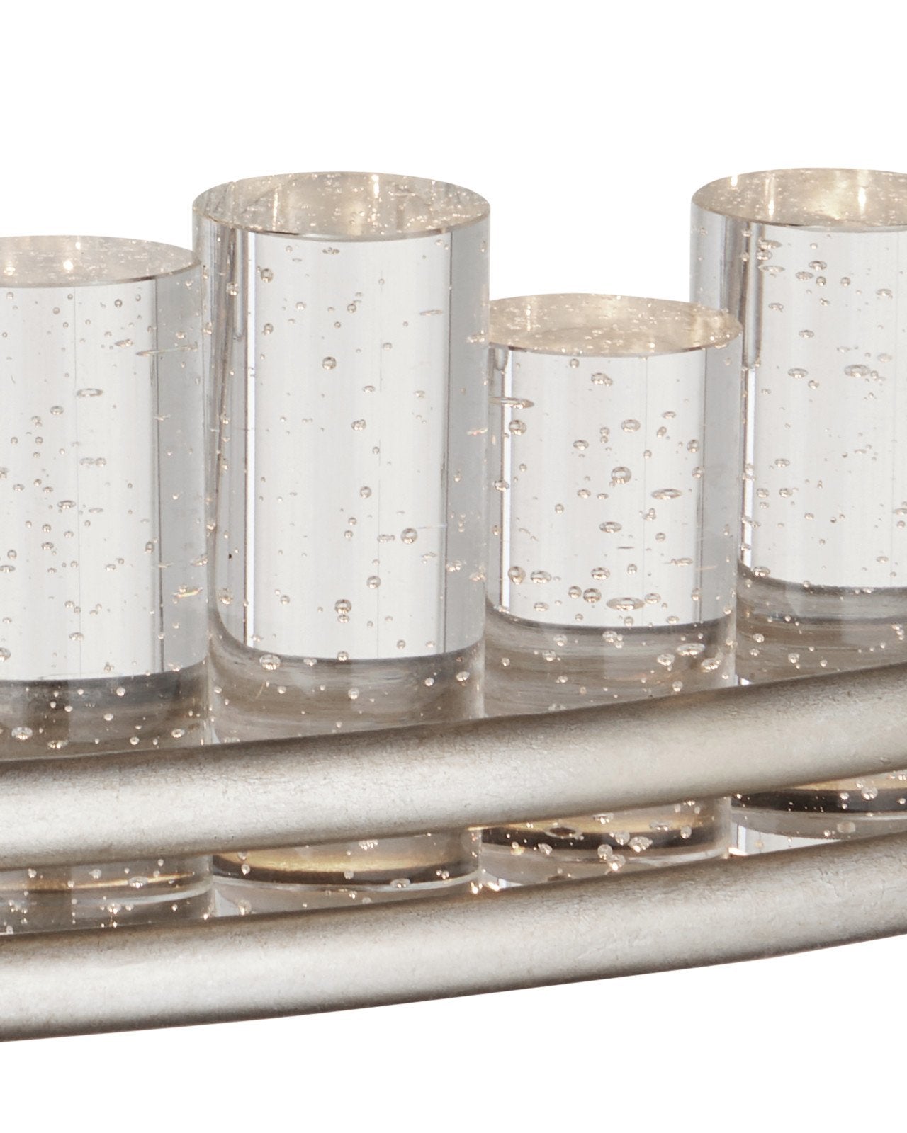 • When envisioning the Pleiades Medium Chandelier, the goal was to create drama with cylindrical pieces of seeded crystal fitted into a generously scaled silver leaf wrought iron ring. The open design of the ring is essential to bring an uptick in the sensational illumination because it is fitted with an integrated LED strip, the light from which effervesces when it strikes the bubbles in the more than 100 crystal rods. The Pleiades is dimmable. Adjustable from 24" to 148" with use of included chain/rod kit/cable. If your space calls for a longer drop, additional chain/rods/cable is available for purchase.