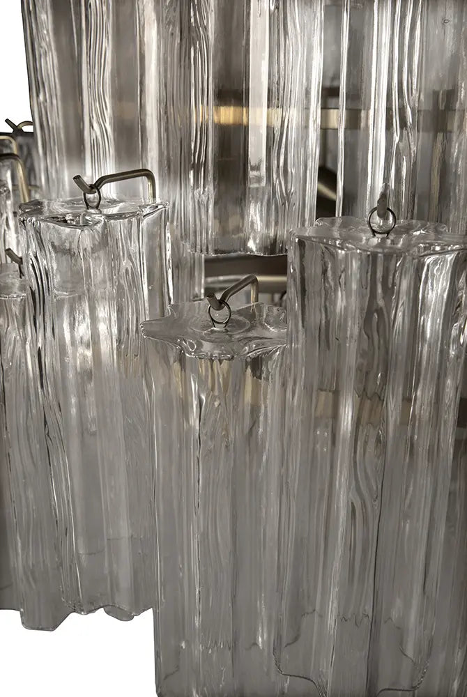 • This chandelier showcases a cascading, tiered design of textured glass arranged in staggered symmetry. Its clear glass and brass framework evokes a refined Mid-Century Modern elegance with dramatic sculptural presence.