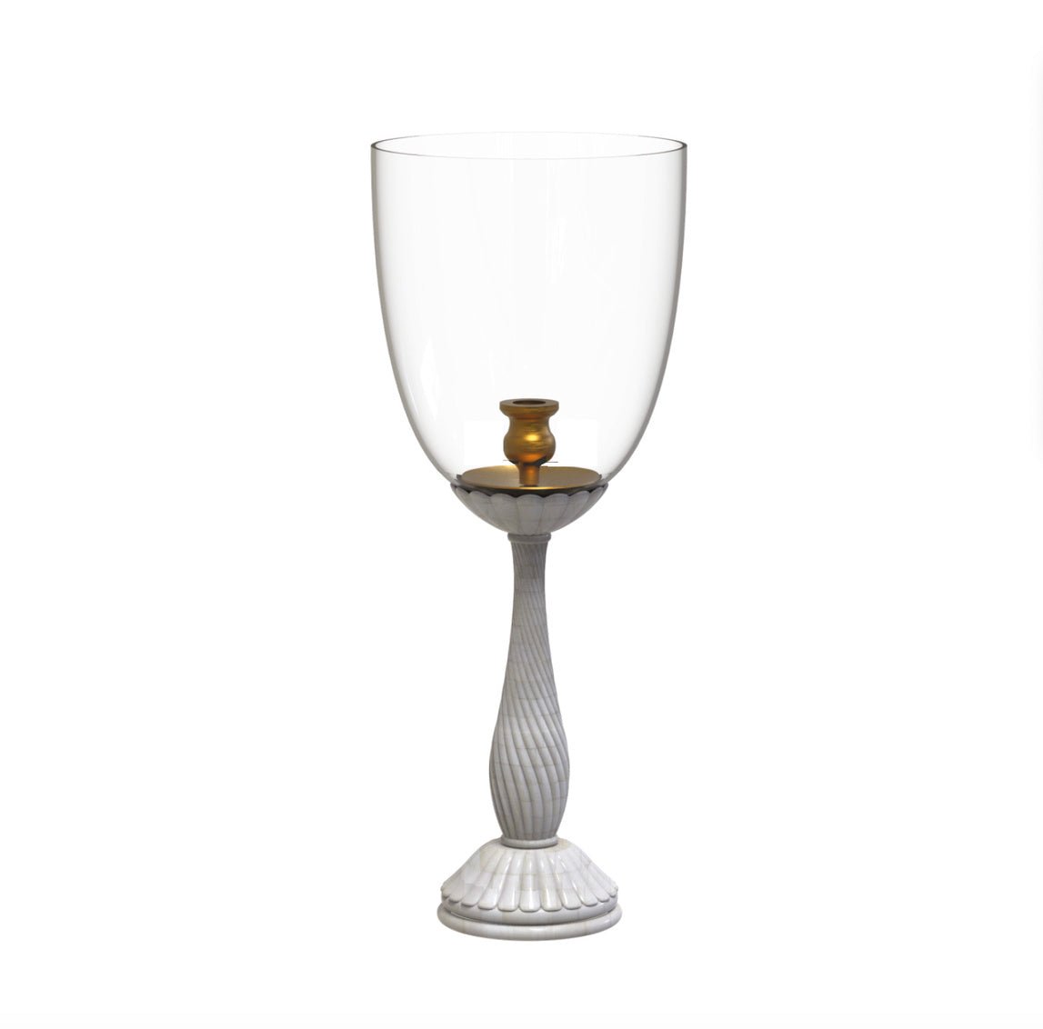 The Chelsea House Beaumont Hurricane looks to the manor born. The elegant pedestal is hand carved from found natural bone in a gathered twist silhouette and crowned with solid brass candle holder and mouth-blown glass hurricane. Amanda loves this statement-making accent gracing an entryway console, paired on a deep mantel, and marched in multiples down the center of a dining table. The abbreviated height affords dinner guests an unobstructed view for easy conversation. Available in two sizes.