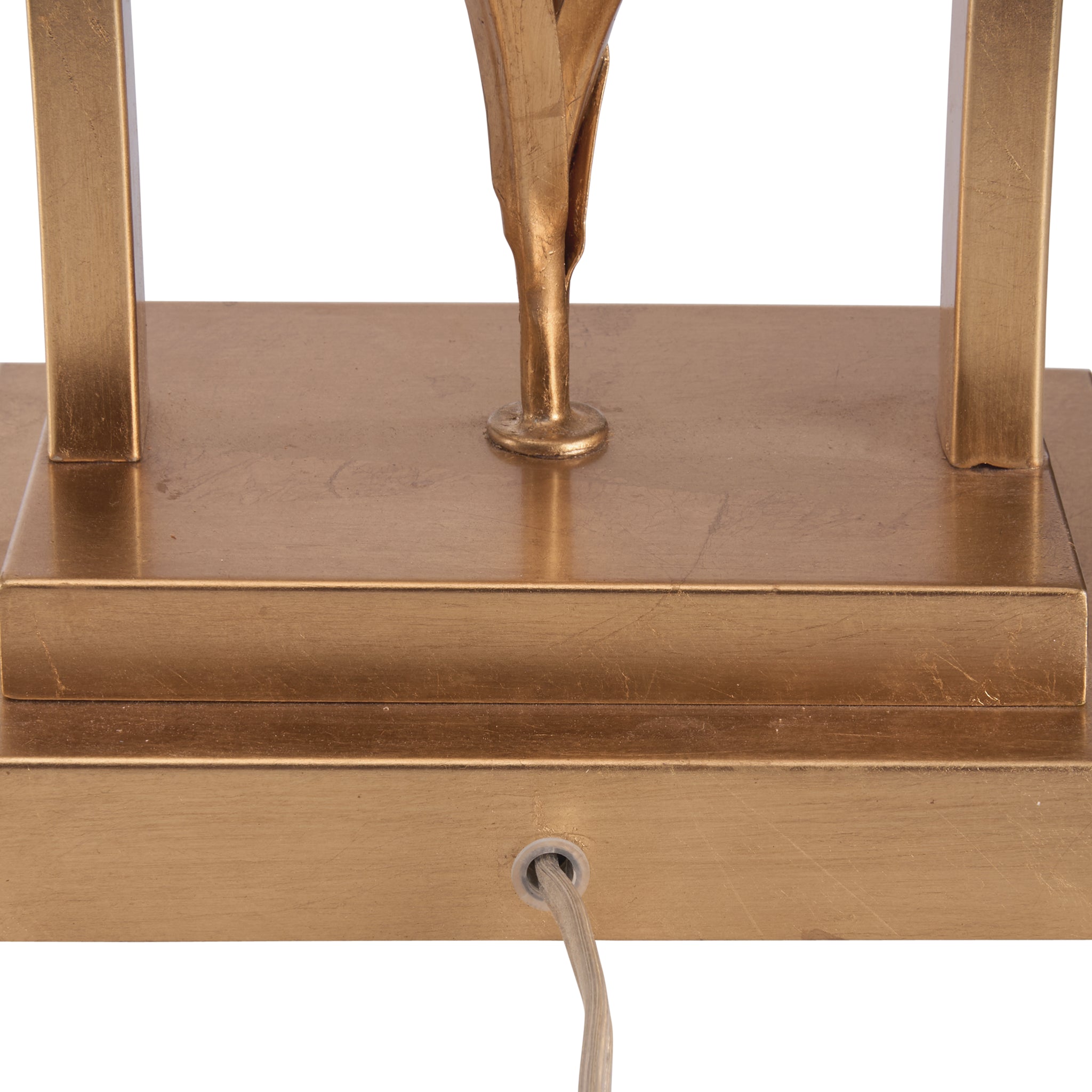 • This elegant lamp showcases a delicate porcelain orchid perched on a gold stem with sculpted leaves, all encased in a graceful gold border, blending floral beauty with refined sophistication. Designed by Bill Cain.