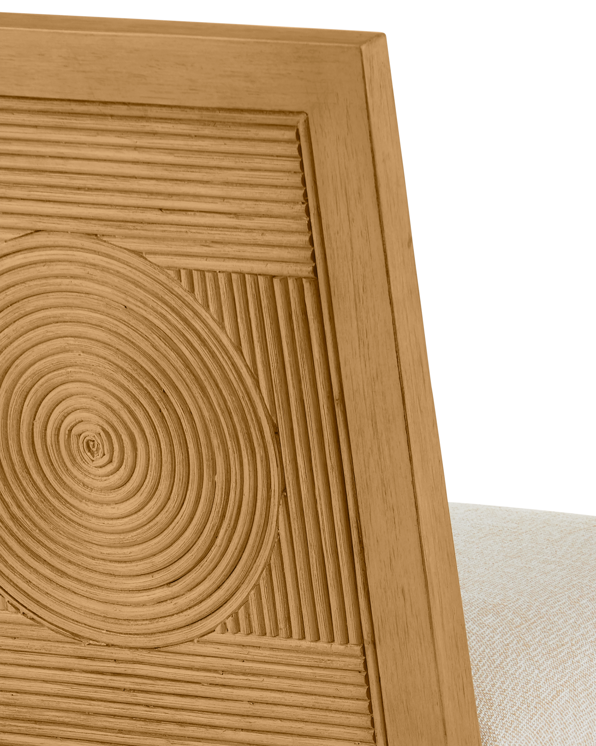 The Santos Sea Sand Bar Stool has a split rattan pattern on the back, which is made by hand and applied to a solid mahogany frame. Once the natural material is in place, a sea sand finish covers the back, frame, and legs. The tan bar stool is upholstered in a Liller Malt material. The stool has brass ferrules with a capped step to add sophistication to the overall design.