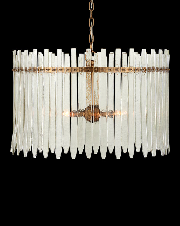 Cascading from the circular frames of our Vintner Chandelier are individually-cut pieces of green glass...
