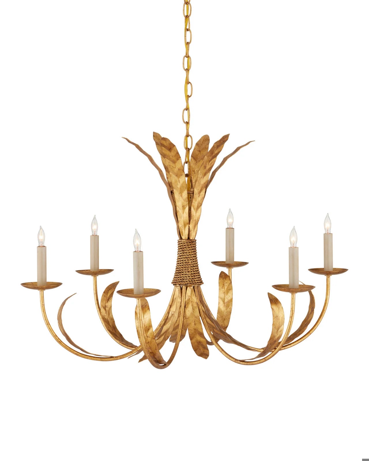 Designed by Bunny Williams for Currey and Company,  the sheaf of feathers ornamenting the classic shape of the Bette Chandelier is a special design note, as is the brilliance of the Grecian gold leaf finish on the wrought iron frame. This beautiful gold chandelier that is cinched in the middle to make it a beautiful form is in our Bunny Williams Collection.