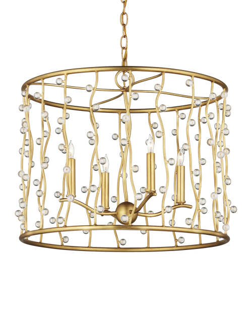 • The Adagio Chandelier is a gold chandelier that adroitly holds its crystal beads, which are affixed to wavy metal wires that flow between the top and bottom rings on tiny barbs. The pieces of crystal are prone to glow even when the lights are not switched on, as is the brilliant contemporary gold leaf finish on the metal. Adjustable from 25.25" to 93.25" with use of included chain/rod kit/cable. If your space calls for a longer drop, additional chain/rods/cable is available for purchase.