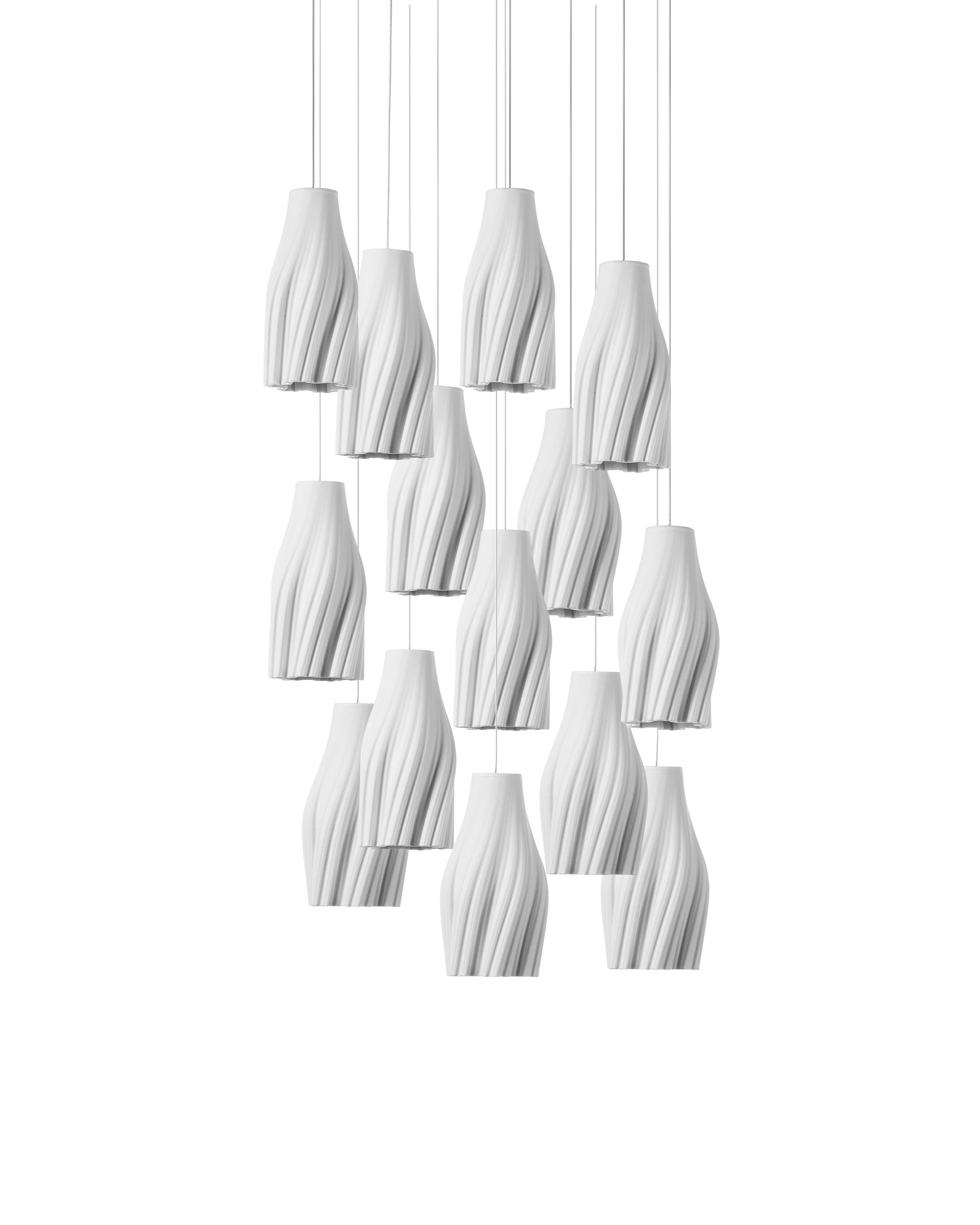 • The Posh 15-Light Round Multi-Drop Pendant has shades made of white ceramic crafted to resemble tassels. The sense of movement created by the material is an artisanal touch that brings the shades a lovely graceful quality. The thin silver cables from which they hangs leave the shades themselves to be the star of the design.