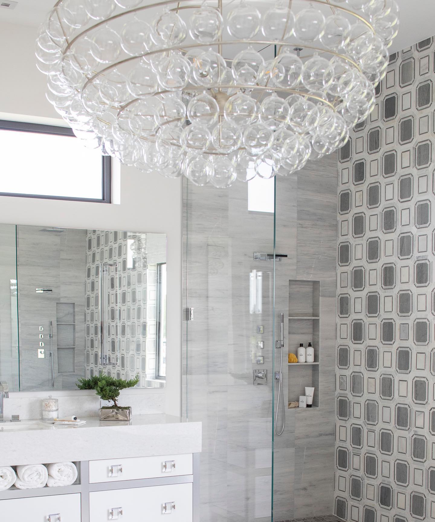 • The striking Stratosphere Chandelier makes a brilliant statement, both in size and in the allure reflected from its ethereal elements. Blown glass balls gleam with reflected light as they circle down the simple wrought iron frame. Adding to the sheen of the silver pendant is a contemporary silver leaf finish.