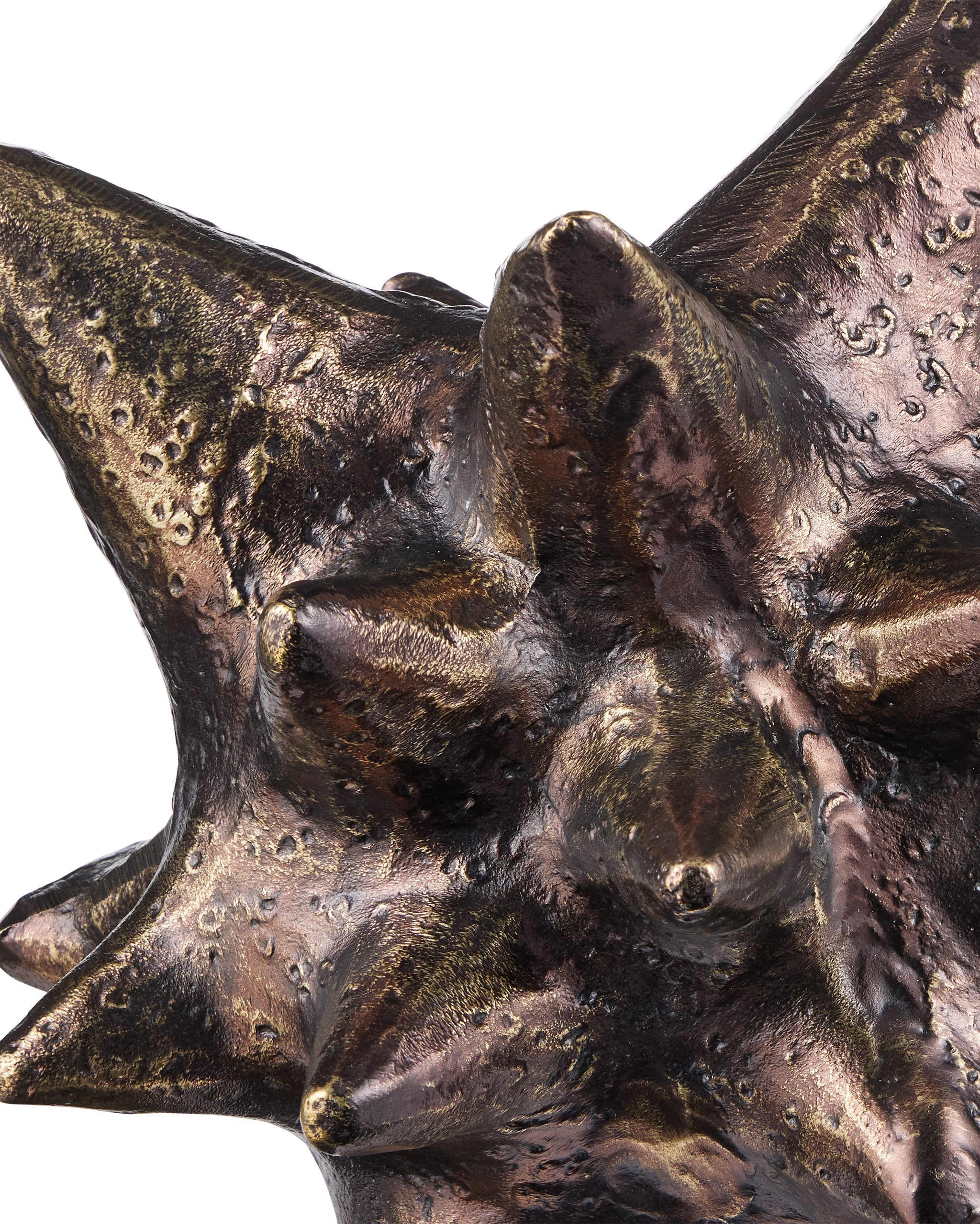 • A pair of spiky decorative accessories, the Jacks Object Set includes two cast aluminum sculptures that gleam in an antique brass finish. Once the pieces are pulled from the mold, artisans treat them to the mottled finish that makes them looked aged.