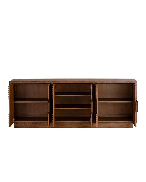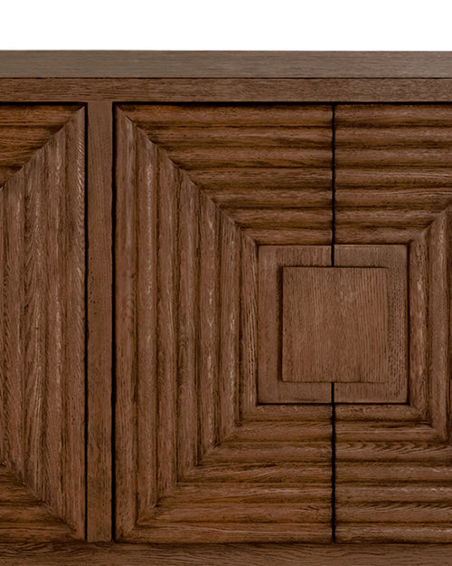 Notable for its extraordinary functionality and cool design, the Morombe Credenza is nothing short of artistry in wood. A deep-toned distressed cocoa finish highlights the skillfully carved patterns of natural wood that form embedded squares in a stylish geometric illusion of depth. Each of the three doors on this credenza has an array of adjustable and fixed shelving for a variety of storage solutions. Also available in white.
