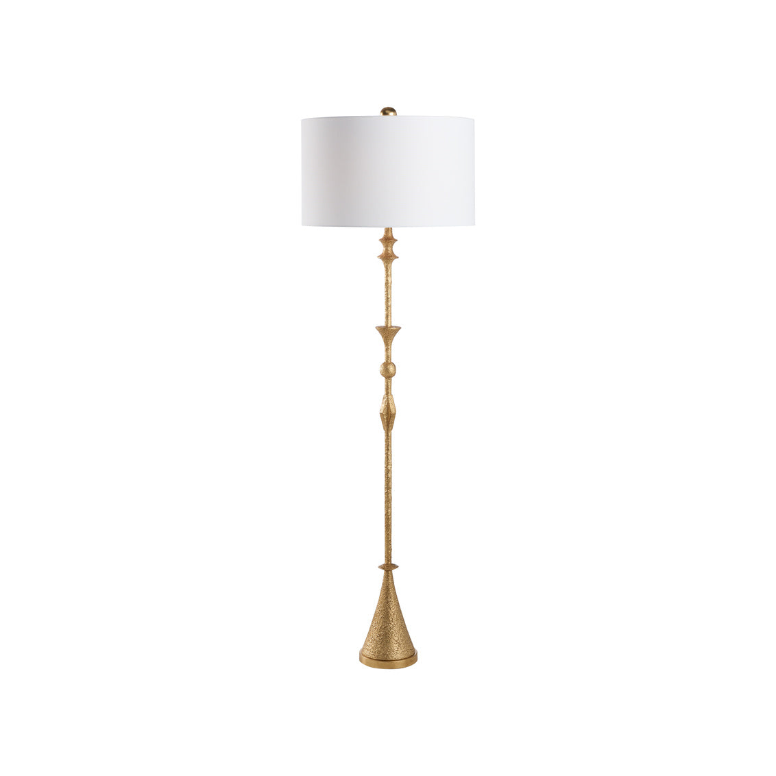 • This floor lamp features a textured gilt finish that adds a with a uniquely sculptural shape blending modern elegance with classic charm. Its versatile design makes it a striking statement piece in both contemporary and traditional interiors. Designed by Jamie Merida.