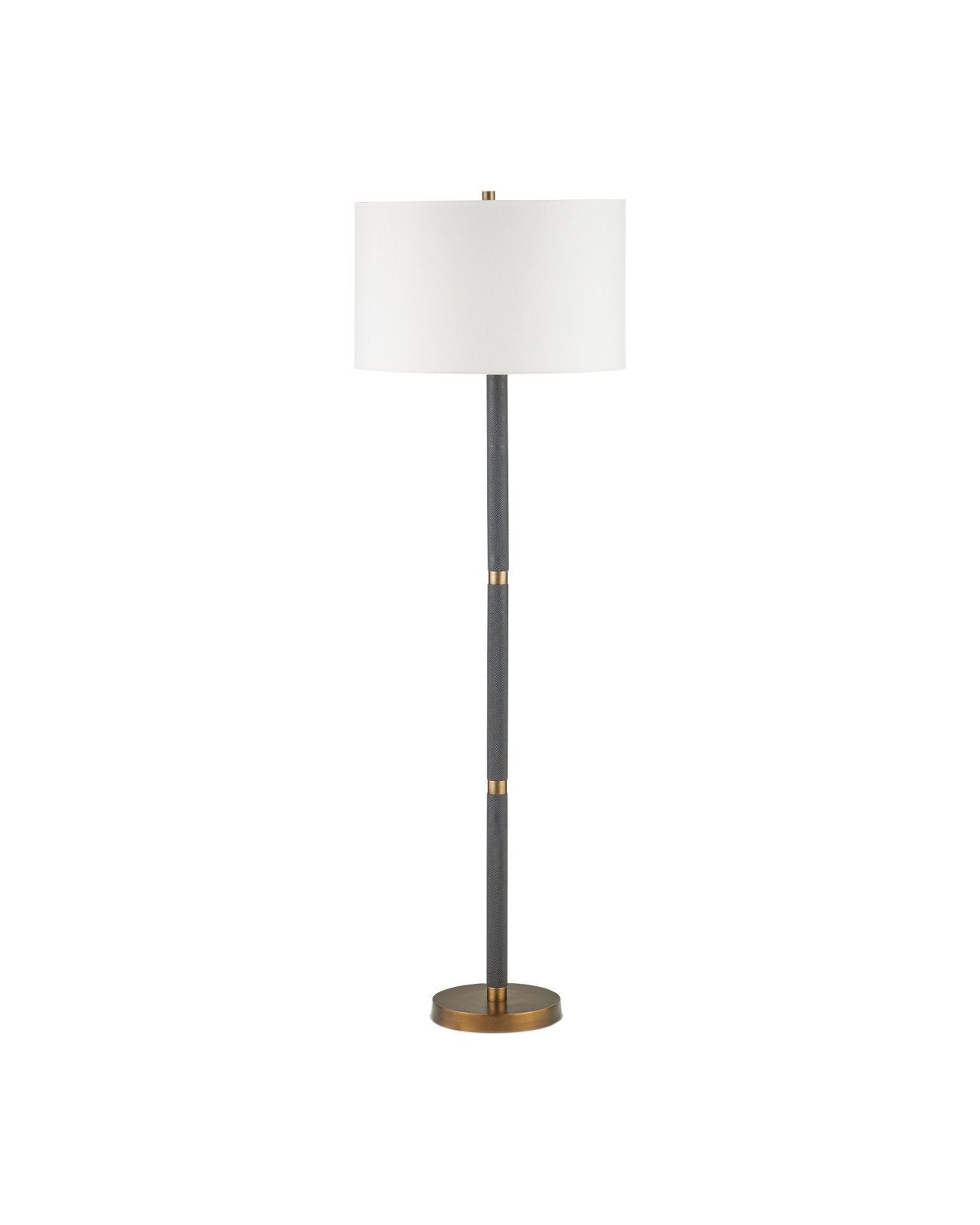 • The Currey & Company Gavin Black Floor Lamp is made of cast aluminum with a tall, slim body divided into three sections finished in matte black.