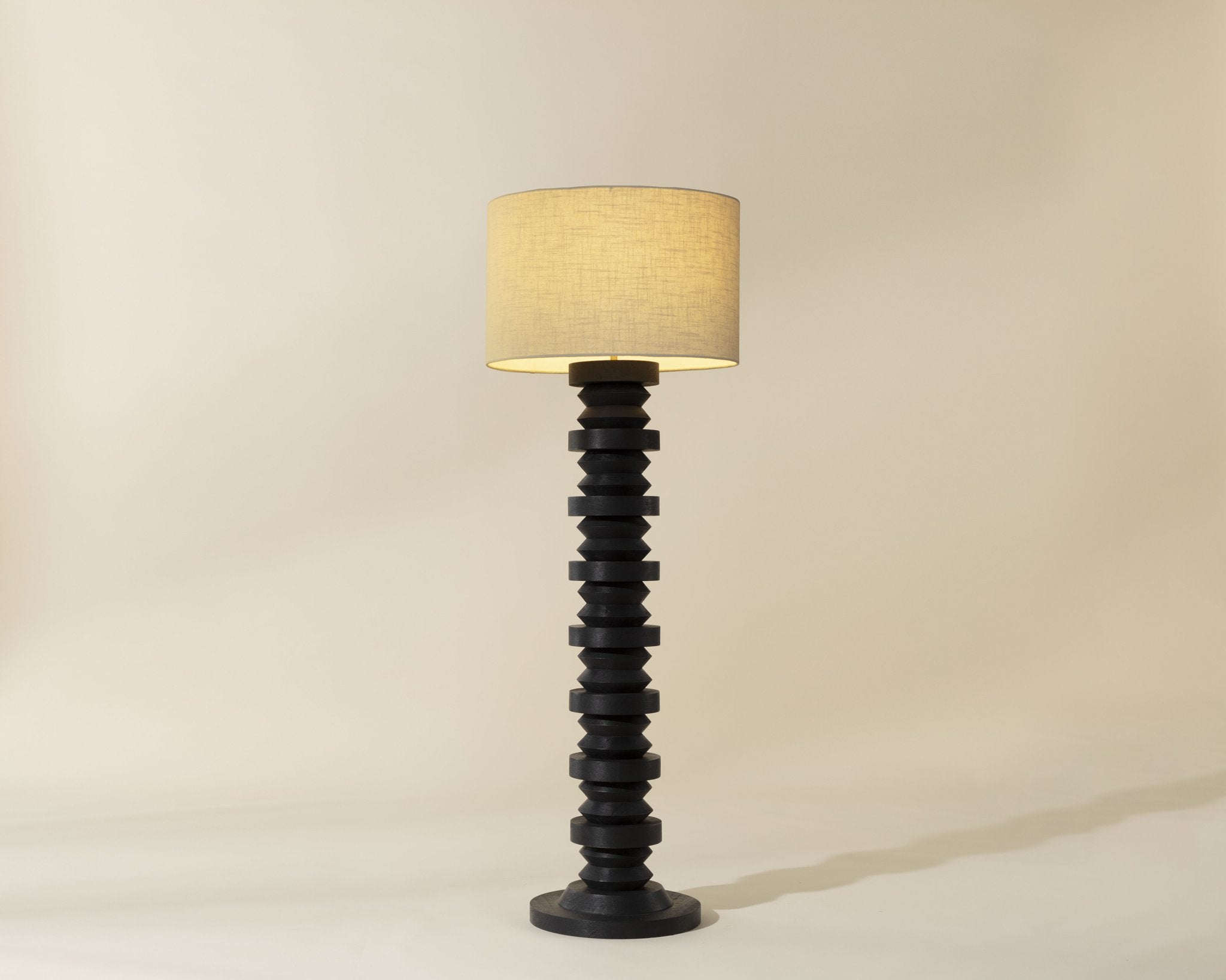 • The Caplo Floor Lamp captures attention with its strong presence. Its sturdy black mango wood base features undulating shapes that infuse the design with distinctive character.