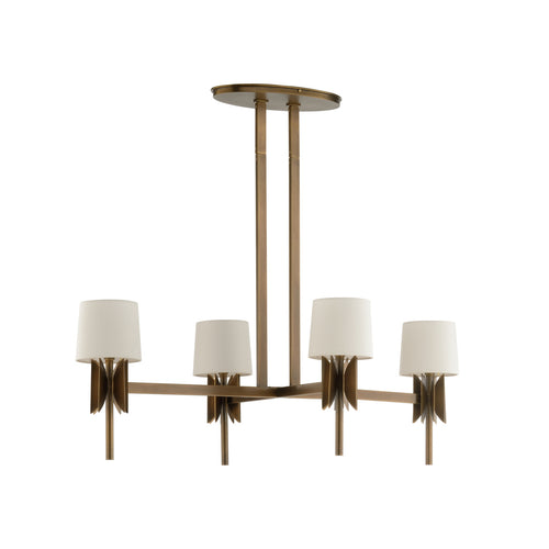 • The Tilling Chandelier is a statement fixture designed to command attention with a touch of grace. Each light source is comprised of an array of antique brass fins and topped with a refined, rolled-edge linen shade creating a dramatic and sculptural statement.