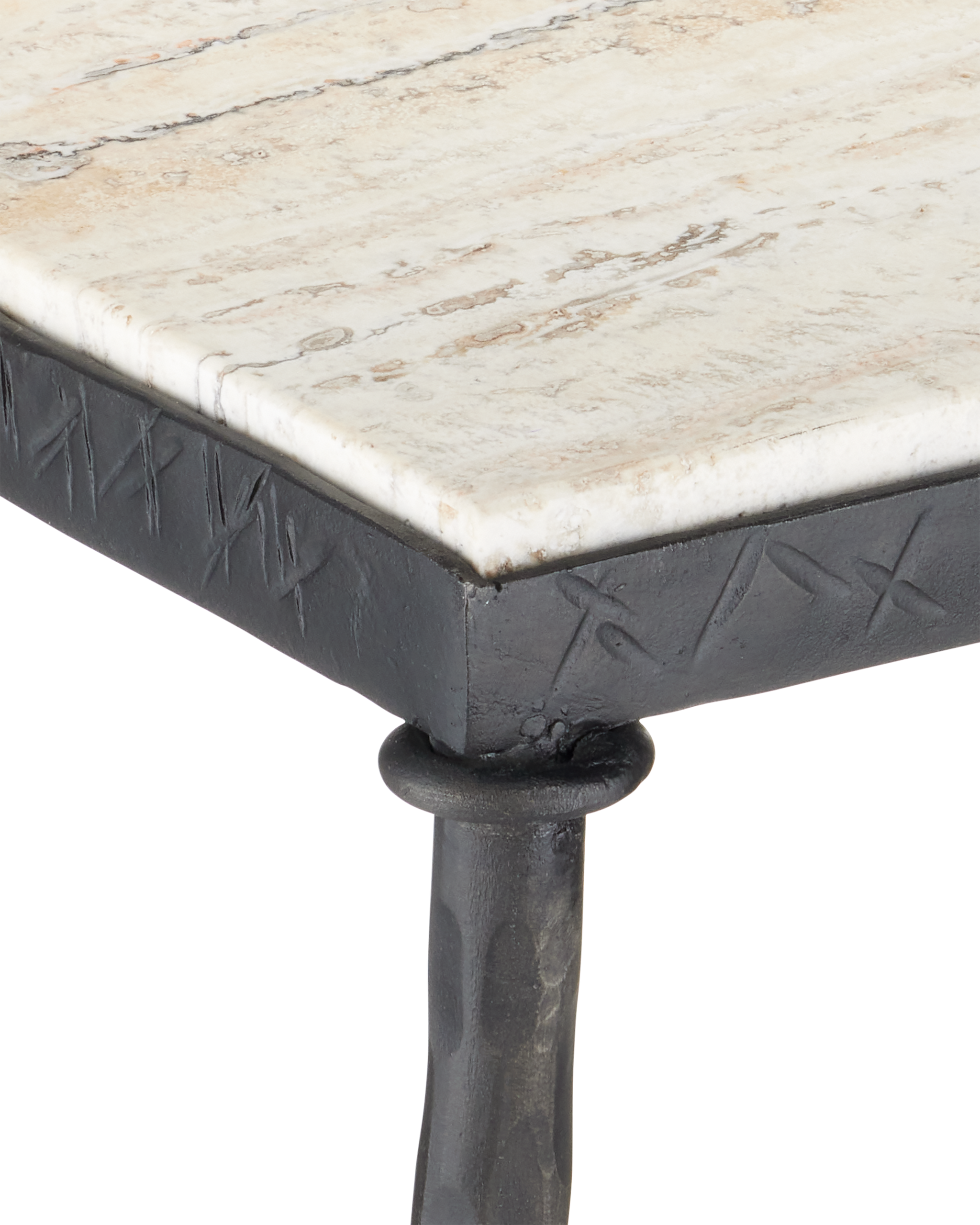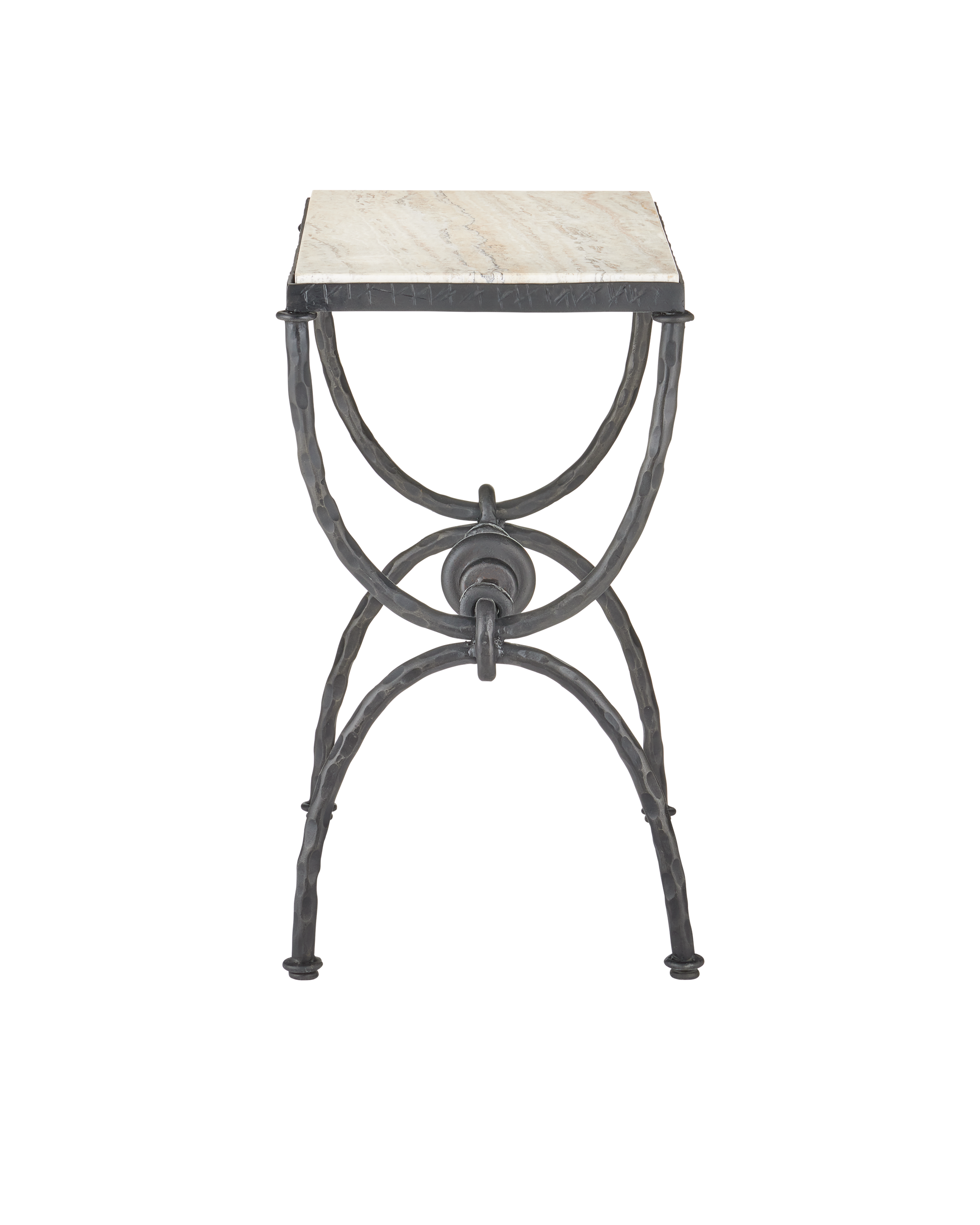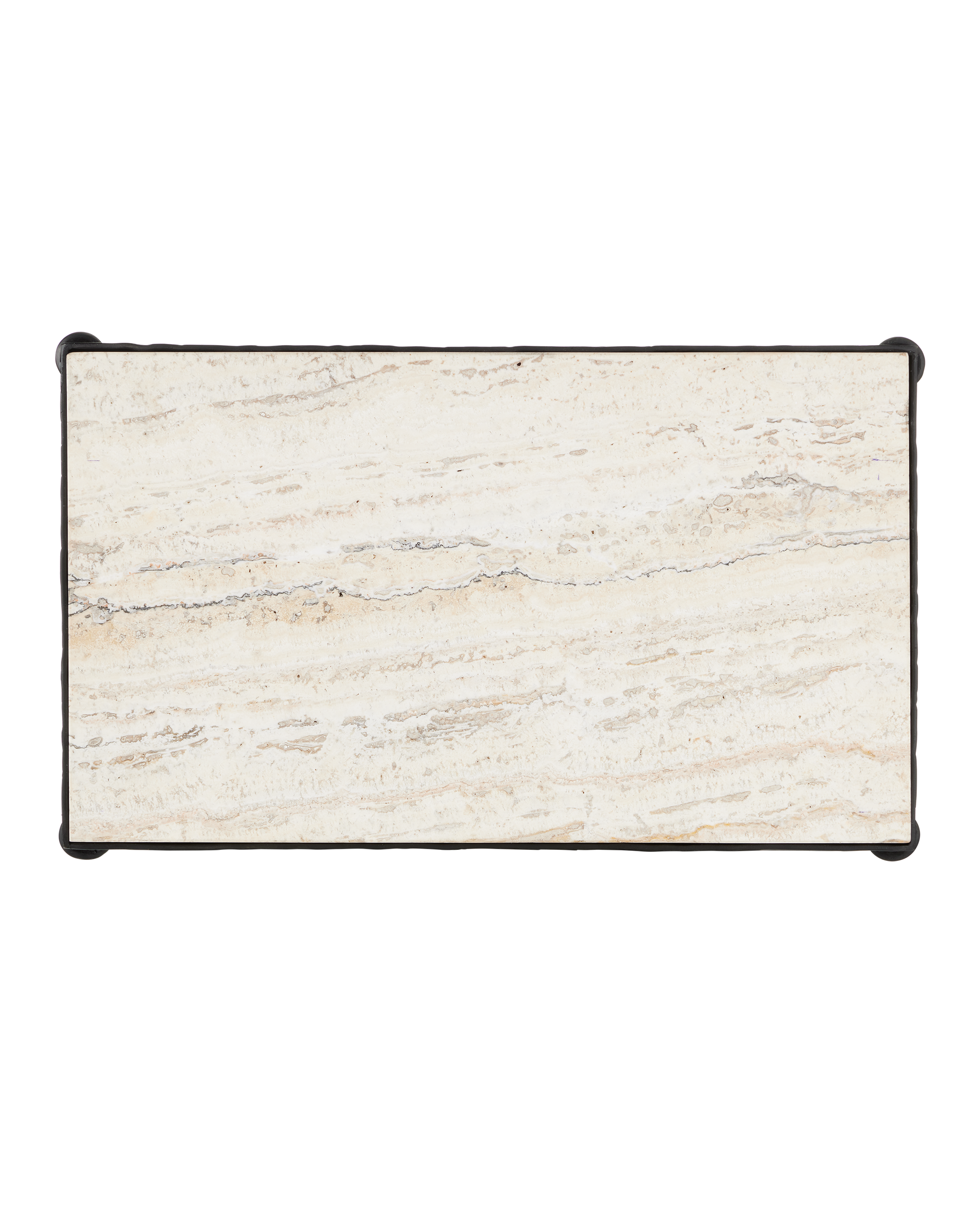 • The Agora White Travertine Side Table draws inspiration from classical Greek design. Its white travertine top has dynamic veining that adds natural texture to the piece. The hourglass-shaped legs give the table a sculptural presence, while a stretcher with decorative orb detailing adds an extra layer of interest. Finished in a rich bronze, the metal frame contrasts beautifully with the light color of the stone, which will vary from piece to piece.