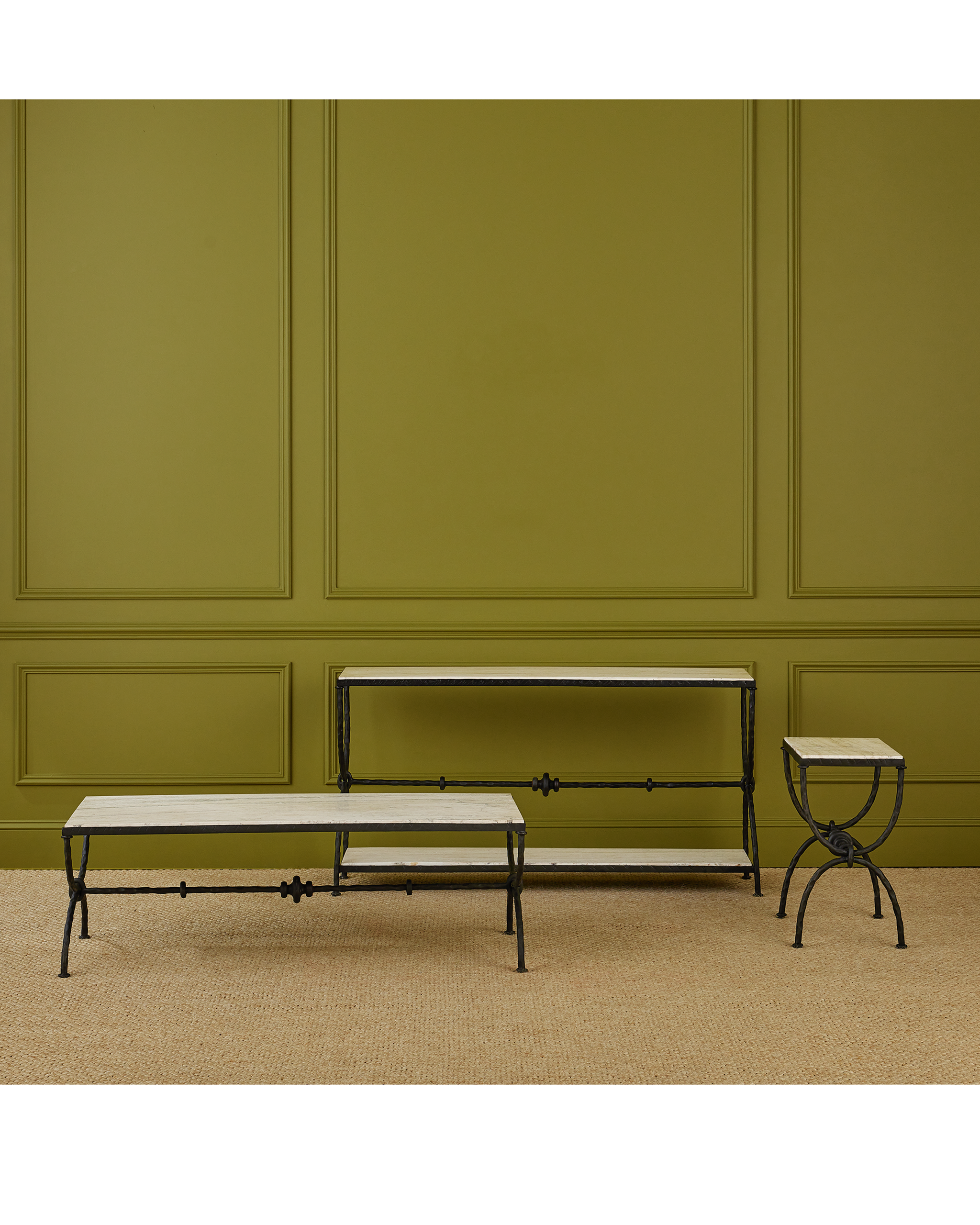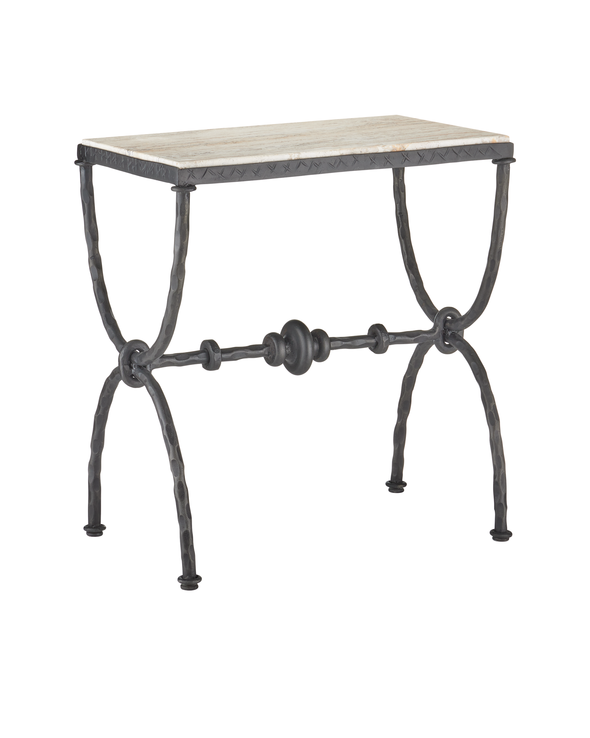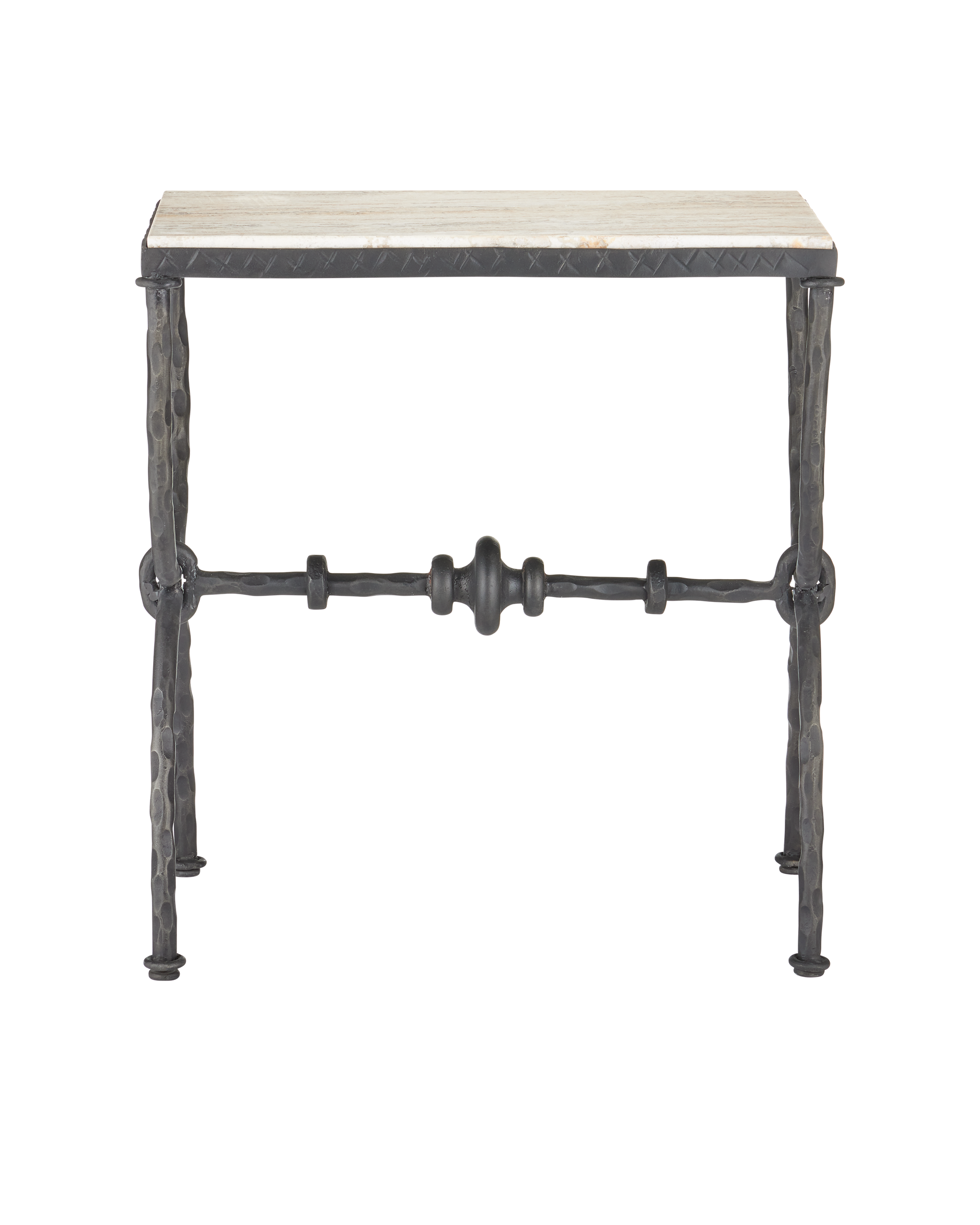 • The Agora White Travertine Side Table draws inspiration from classical Greek design. Its white travertine top has dynamic veining that adds natural texture to the piece. The hourglass-shaped legs give the table a sculptural presence, while a stretcher with decorative orb detailing adds an extra layer of interest. Finished in a rich bronze, the metal frame contrasts beautifully with the light color of the stone, which will vary from piece to piece.