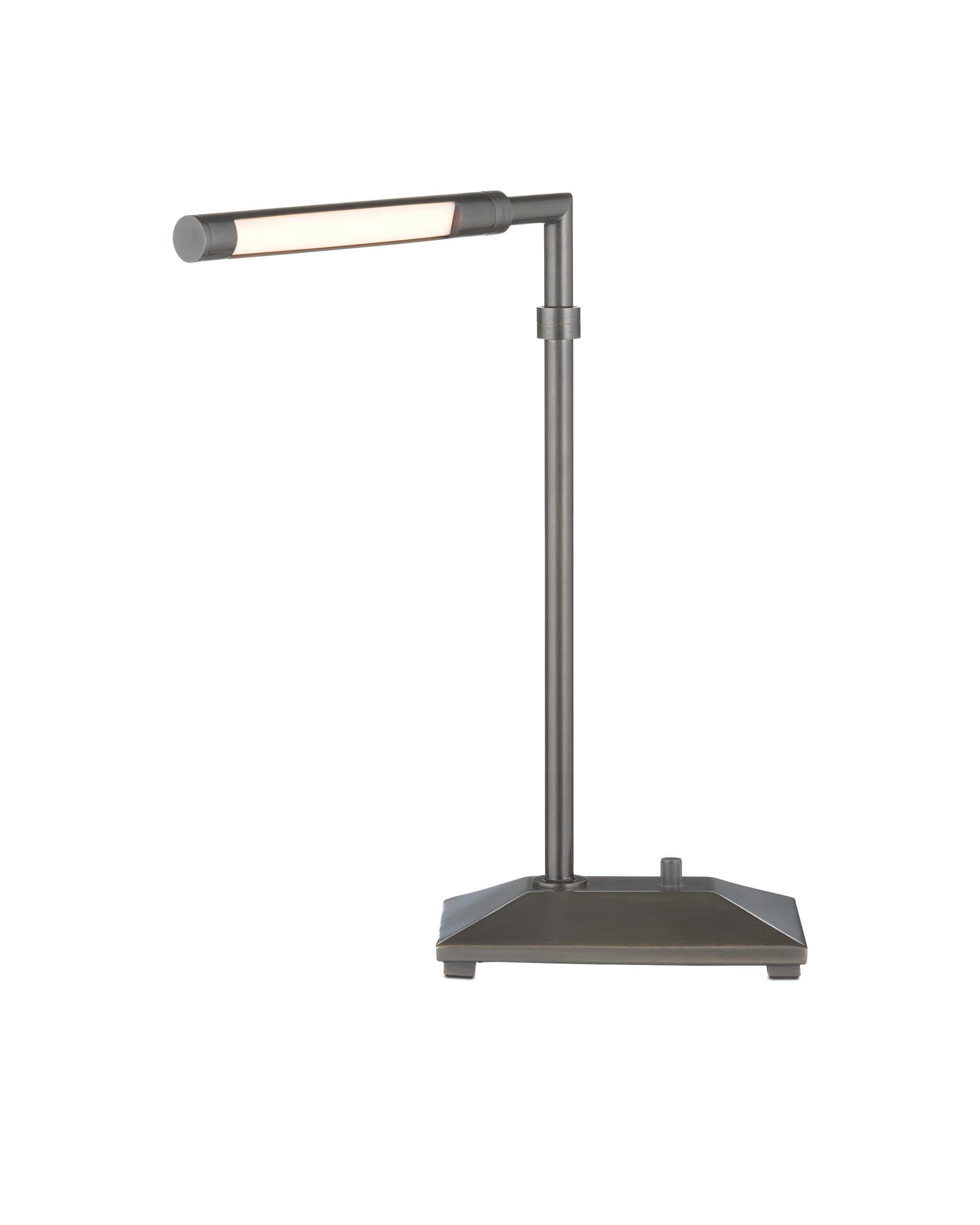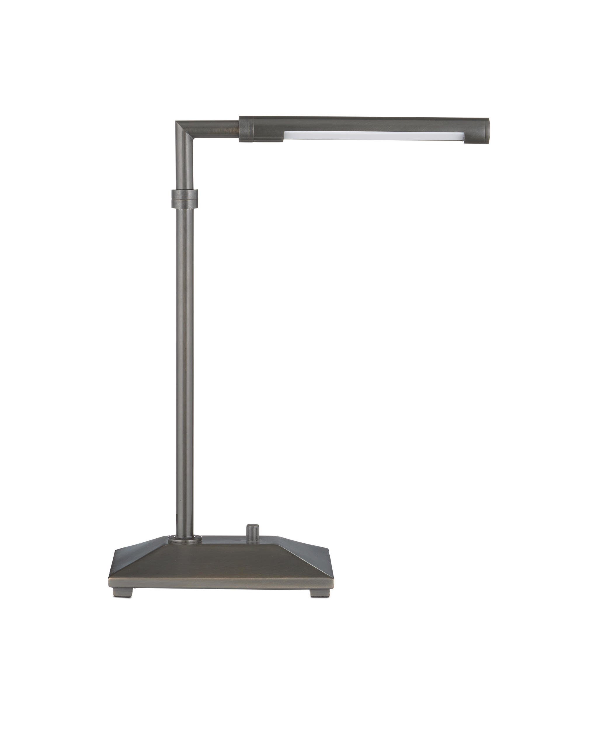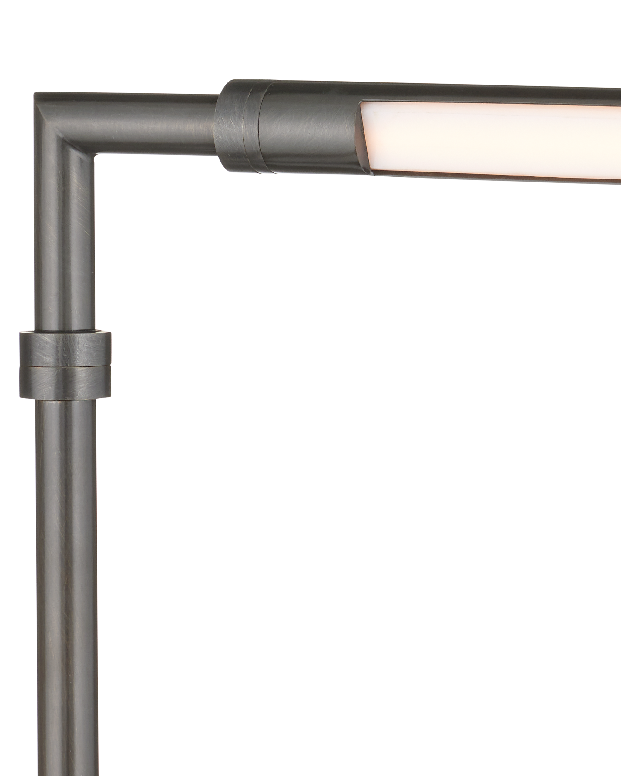 • The Autrand Bronze Desk Lamp is a nimble fixture that focuses illumination wherever it is needed most, as it swivels from side to side and the tubular shade on the top arm can be maneuvered to cast light up, down, or right to left. Made of metal in an oil-rubbed bronze finish, the simple lines of this desk lamp make it great for any number of interior styles, including contemporary. The lamp has a dimmer switch and is lit with integrated LED technology.