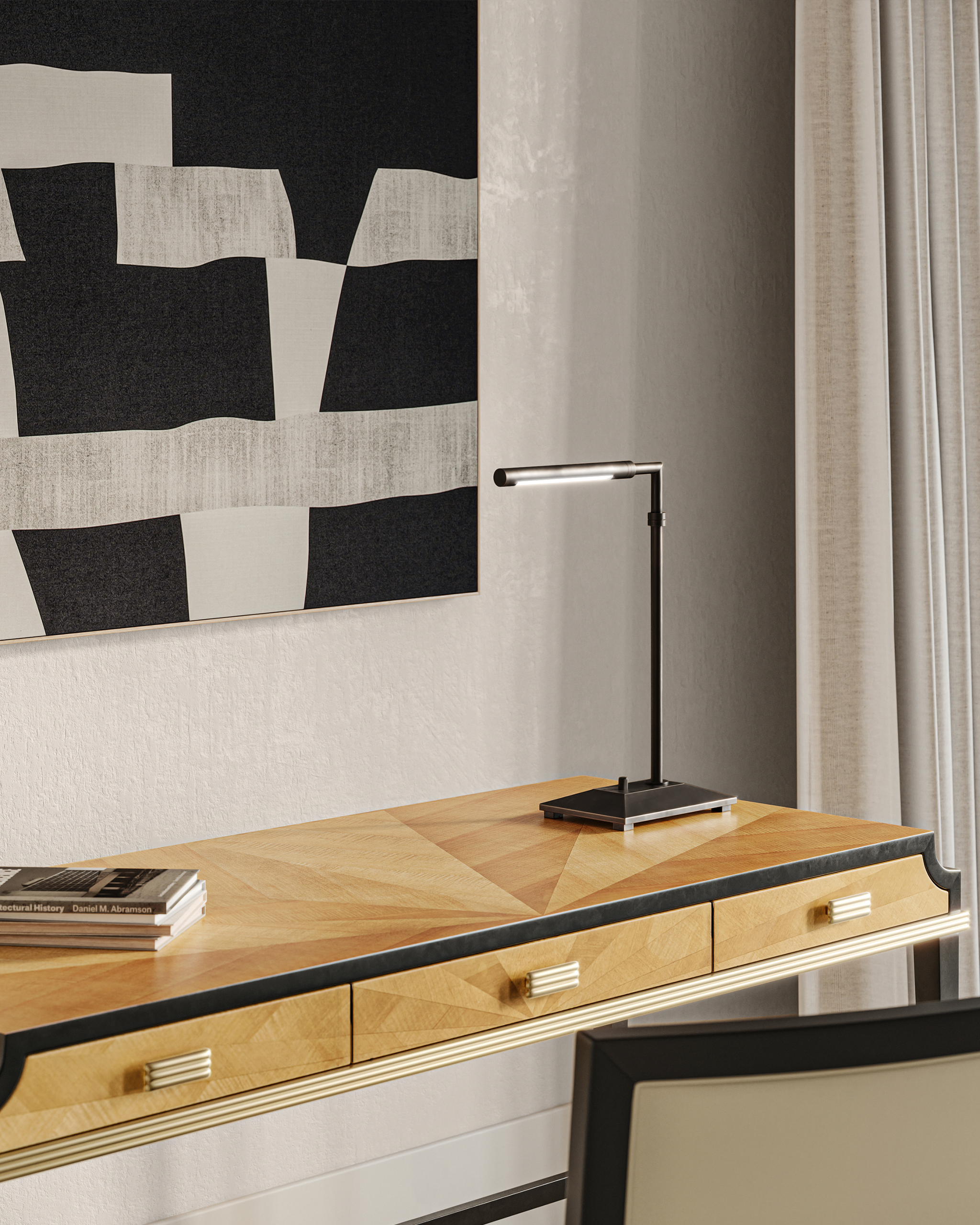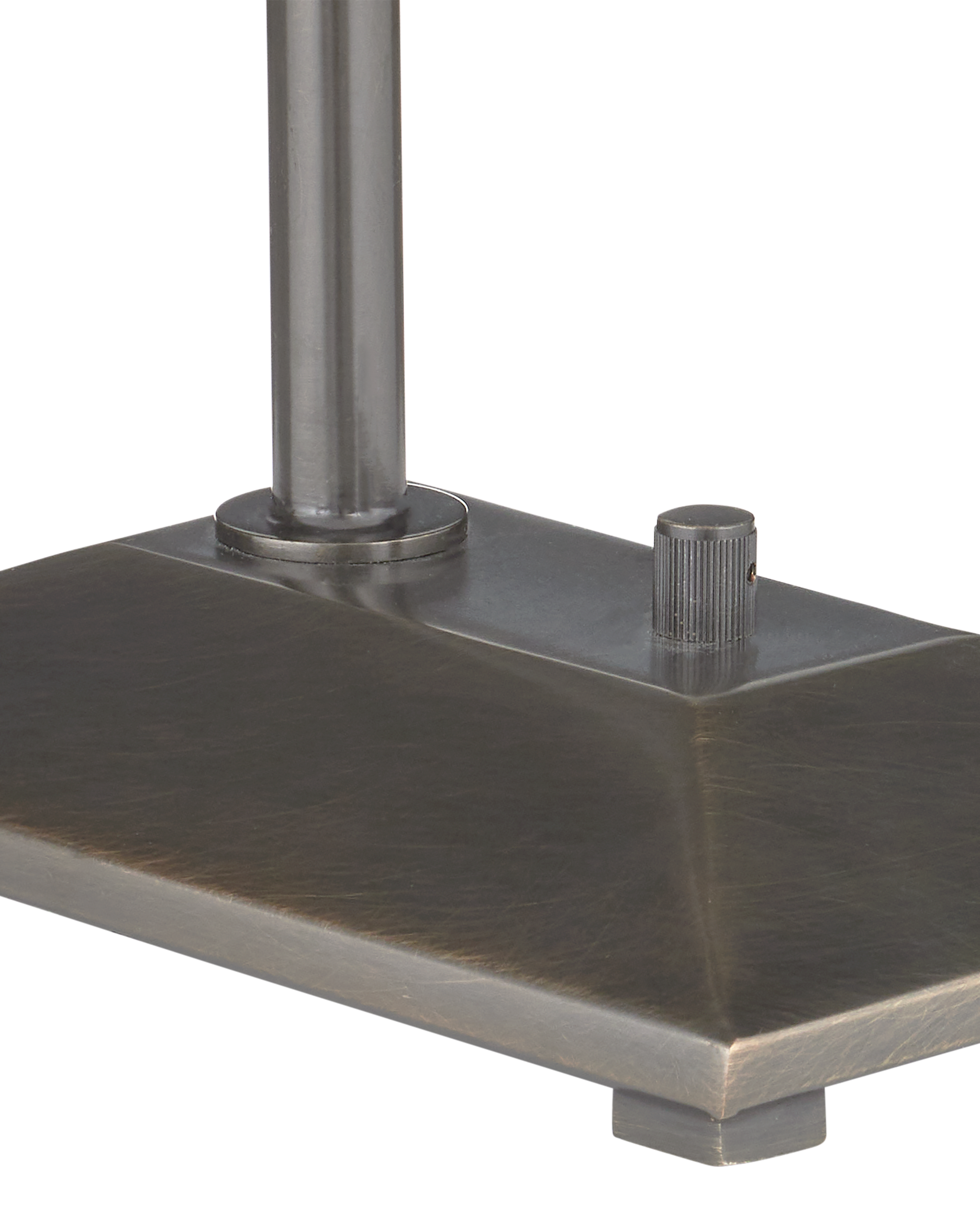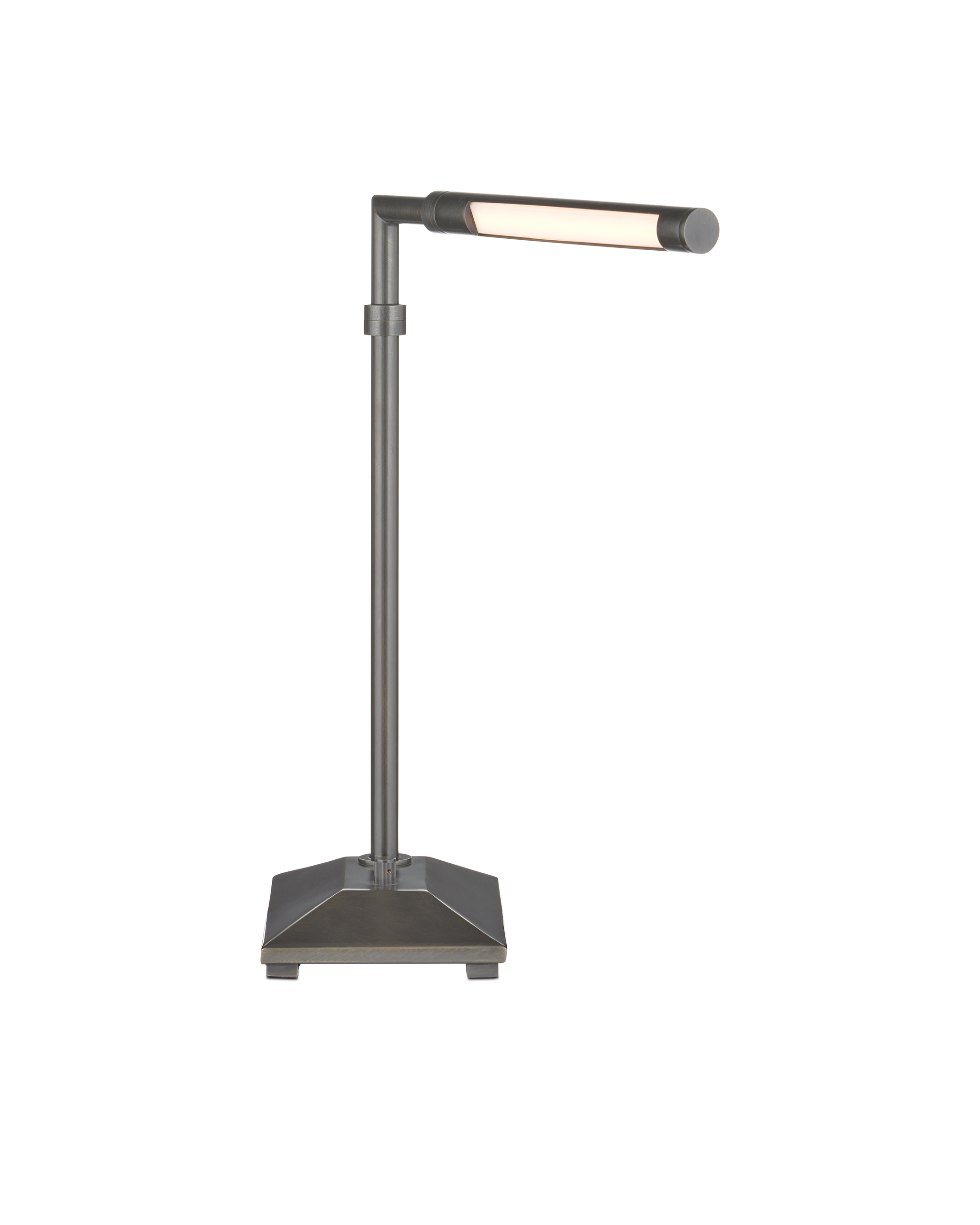 • The Autrand Bronze Desk Lamp is a nimble fixture that focuses illumination wherever it is needed most, as it swivels from side to side and the tubular shade on the top arm can be maneuvered to cast light up, down, or right to left. Made of metal in an oil-rubbed bronze finish, the simple lines of this desk lamp make it great for any number of interior styles, including contemporary. The lamp has a dimmer switch and is lit with integrated LED technology.