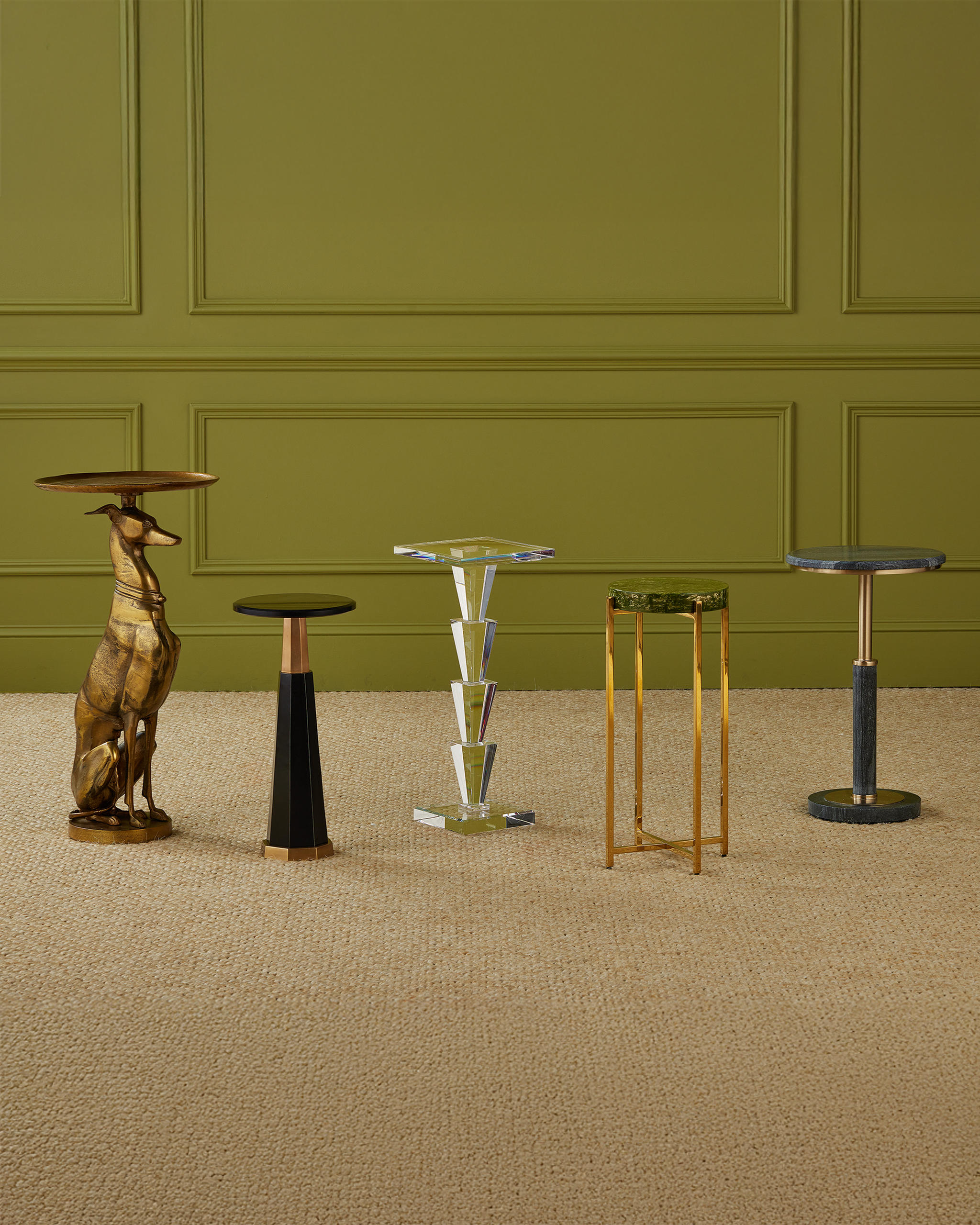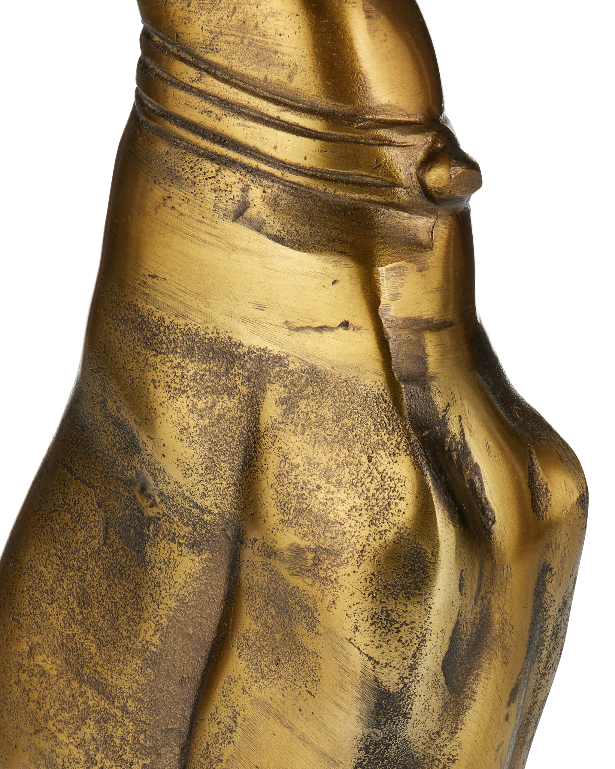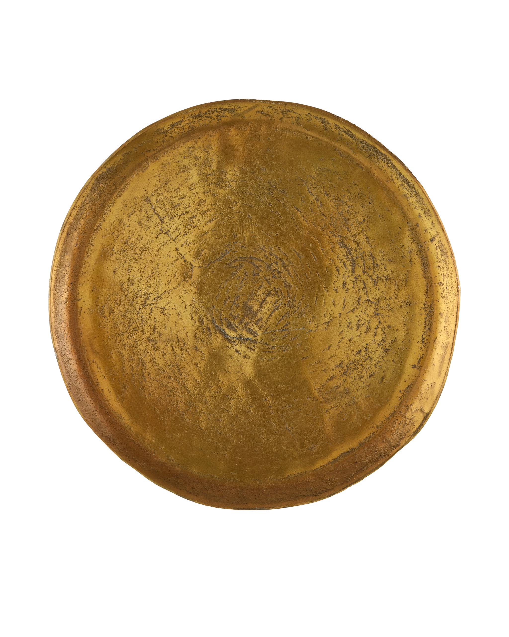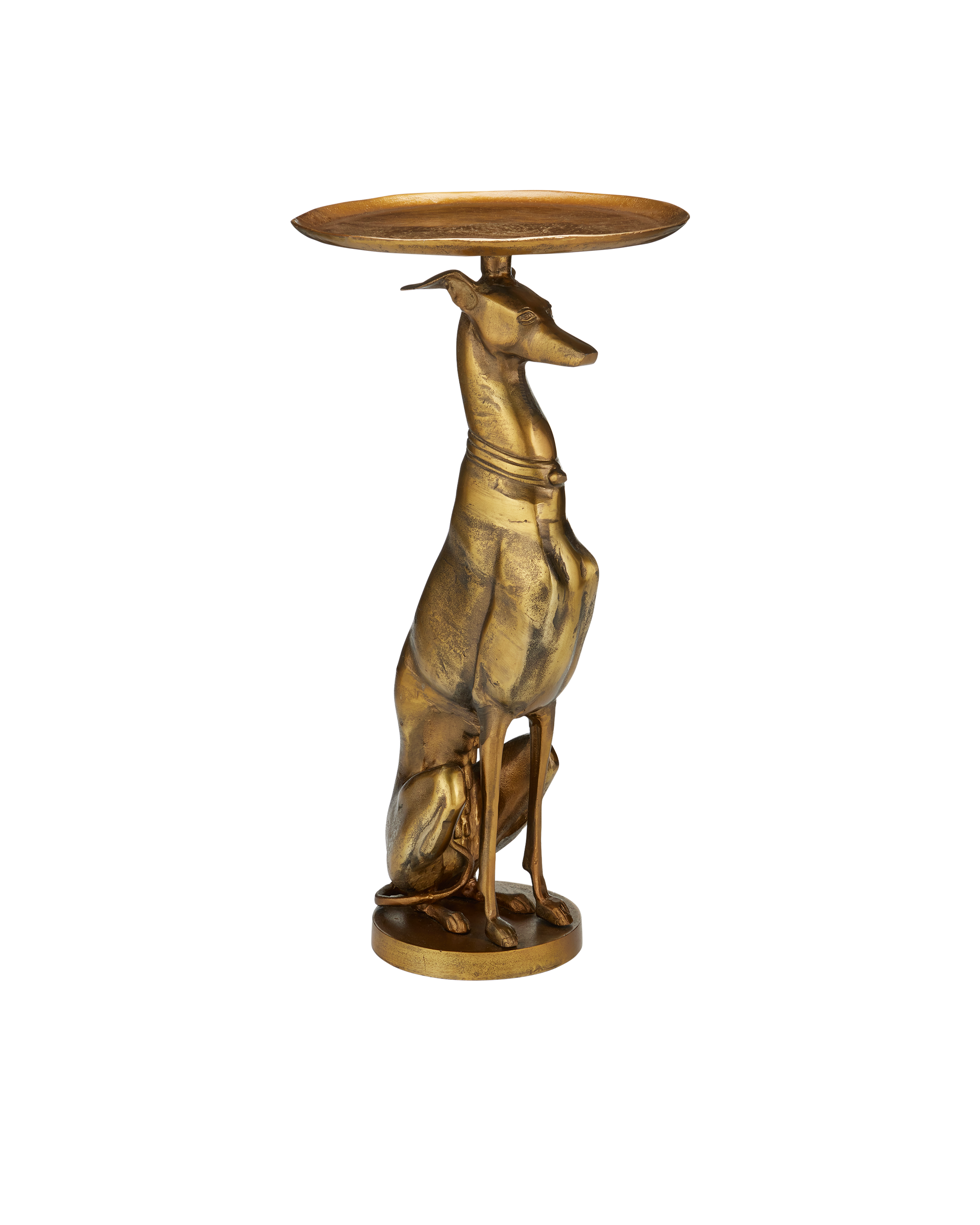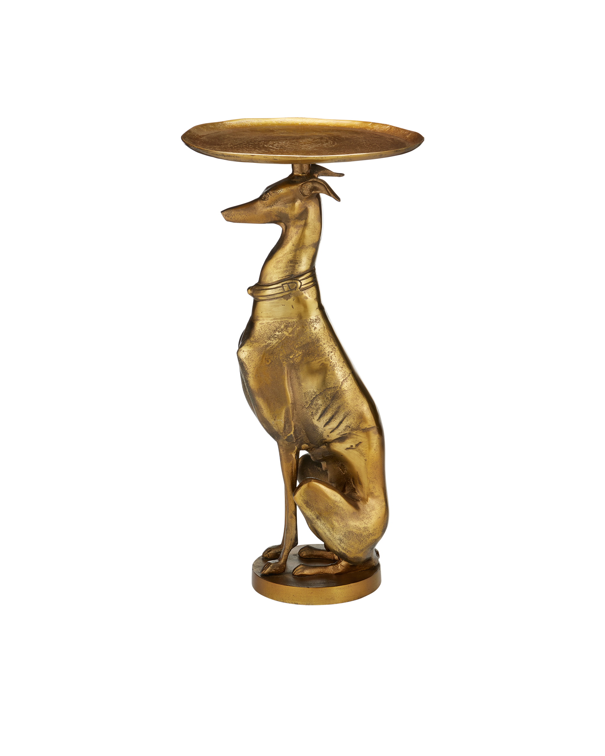 • The Ballyregan Brass Accent Table is made of cast aluminum with a warm antique brass finish and tremendous winning style. The gold accent table is named after Ballyregan Bob, an iconic modern greyhound from England who set the world record for the most consecutive victories in professional dog races during the mid-1980s. The stippling on the surface of this piece represents the artistry of the highly skilled artisans in the foundry where it was made.