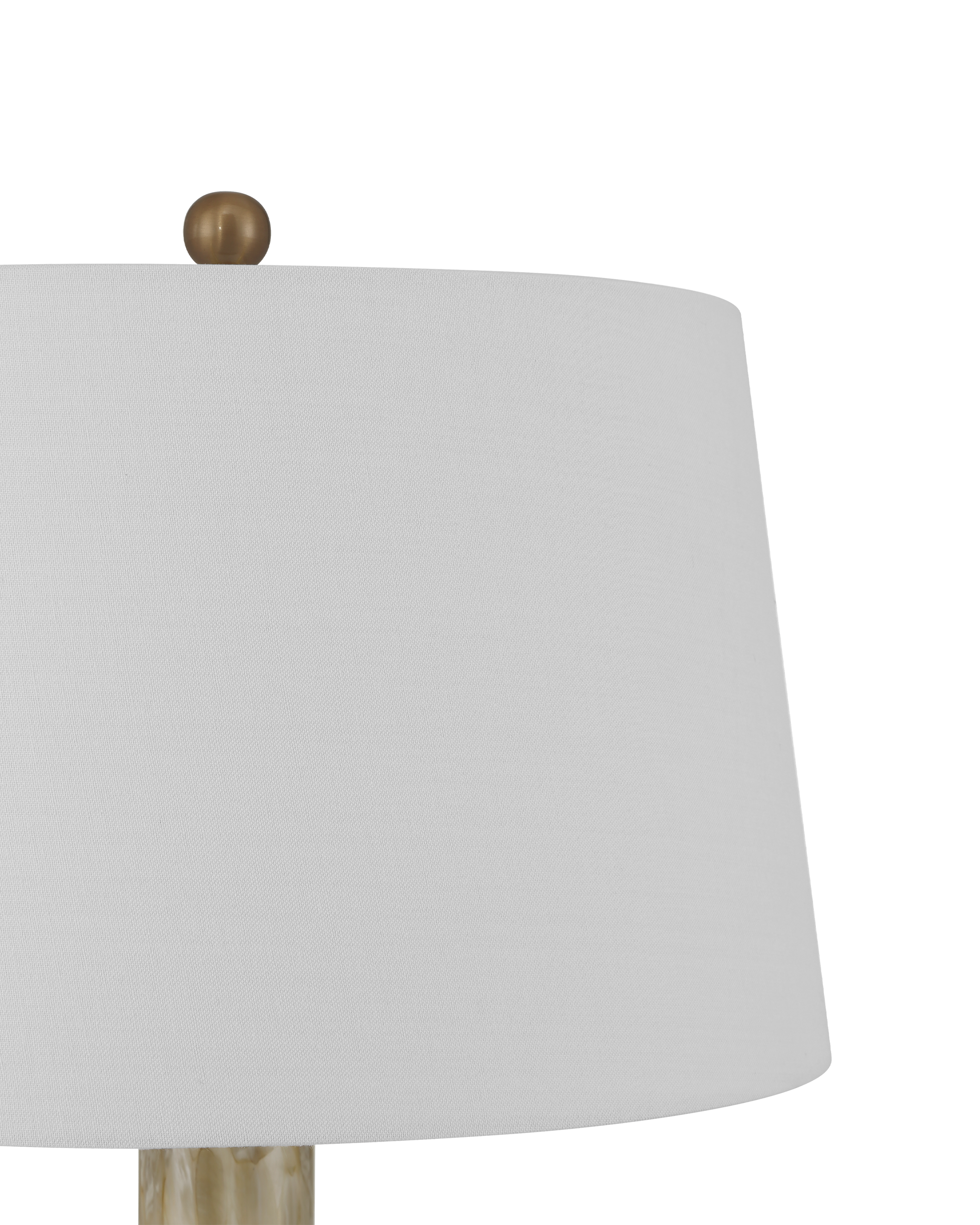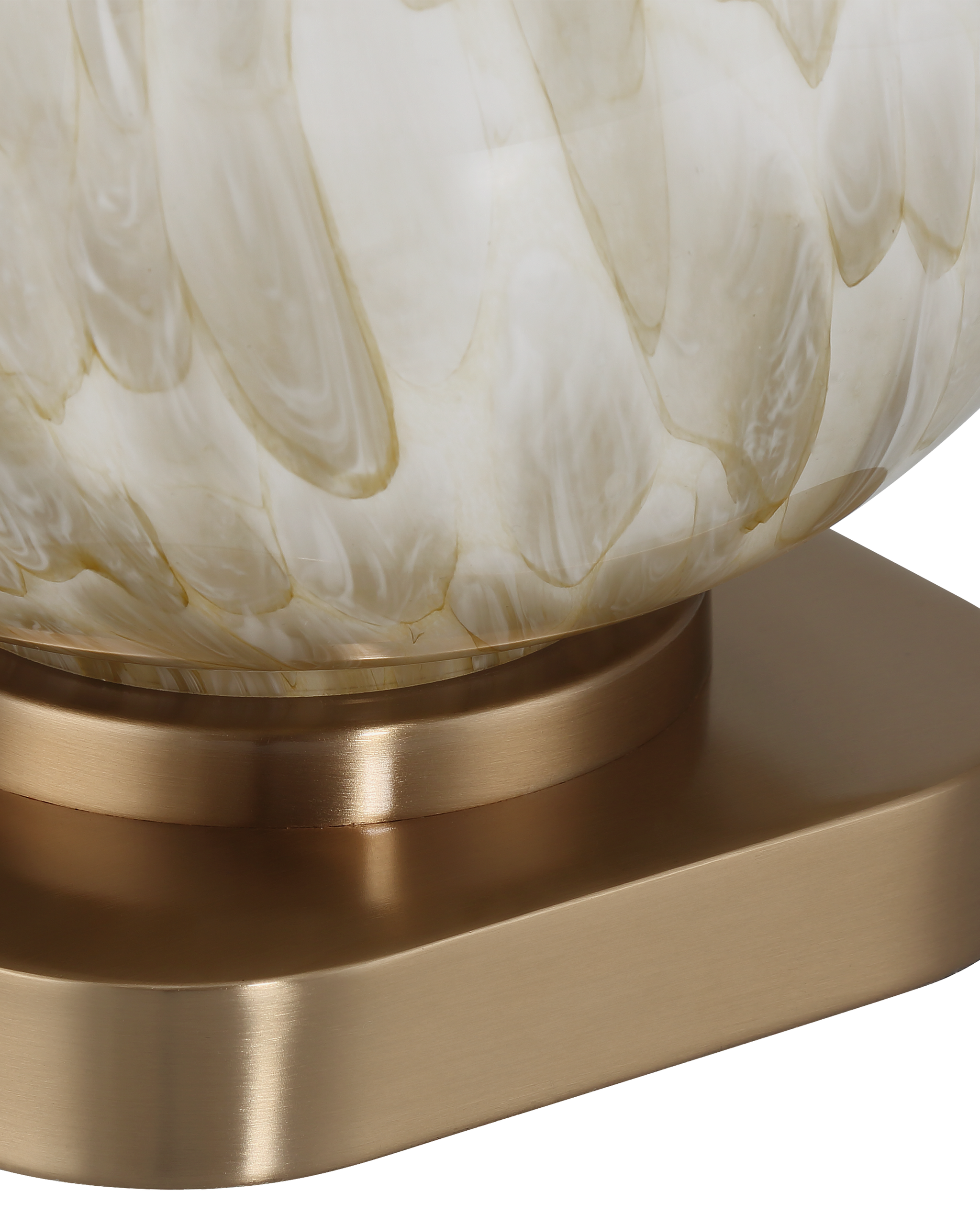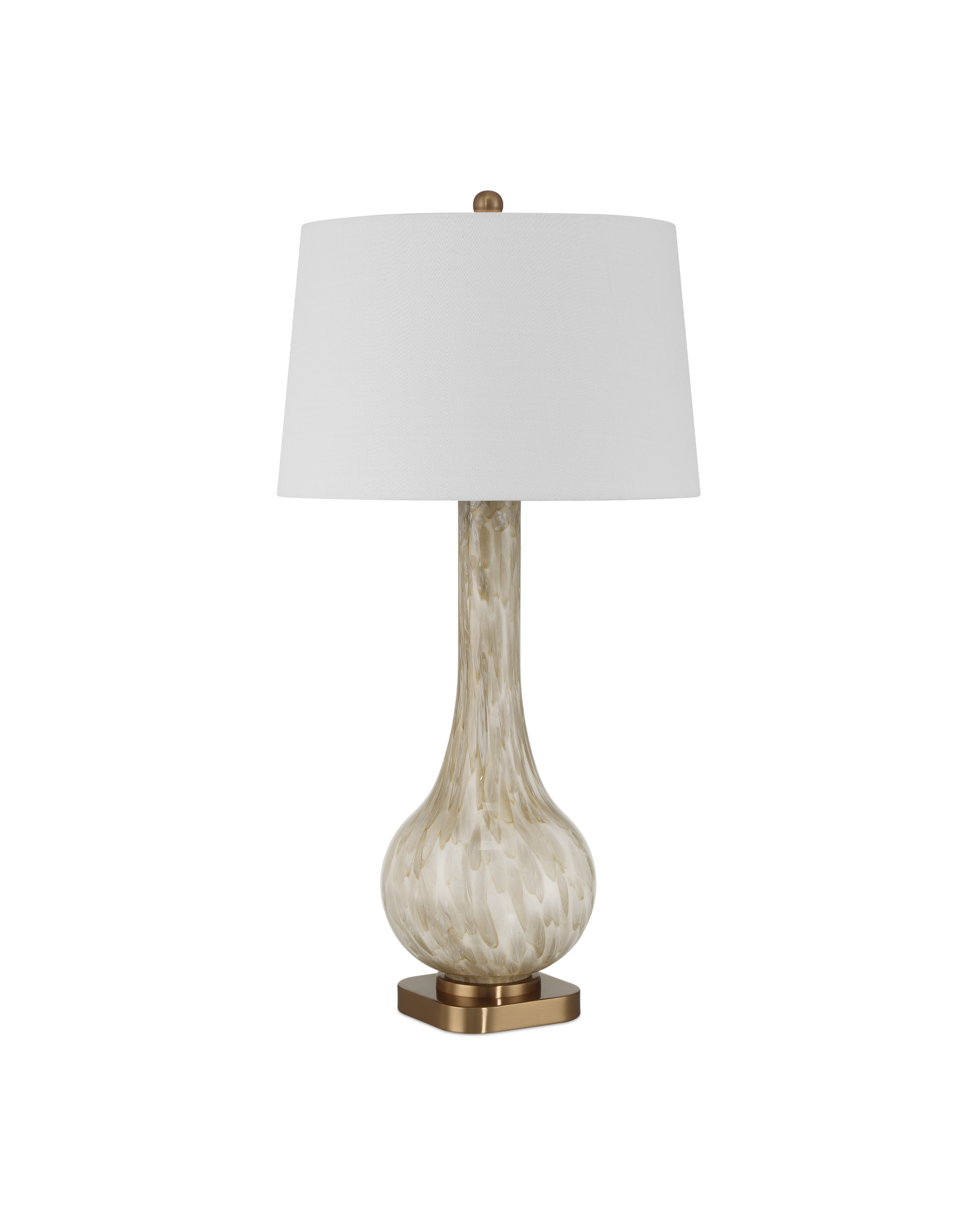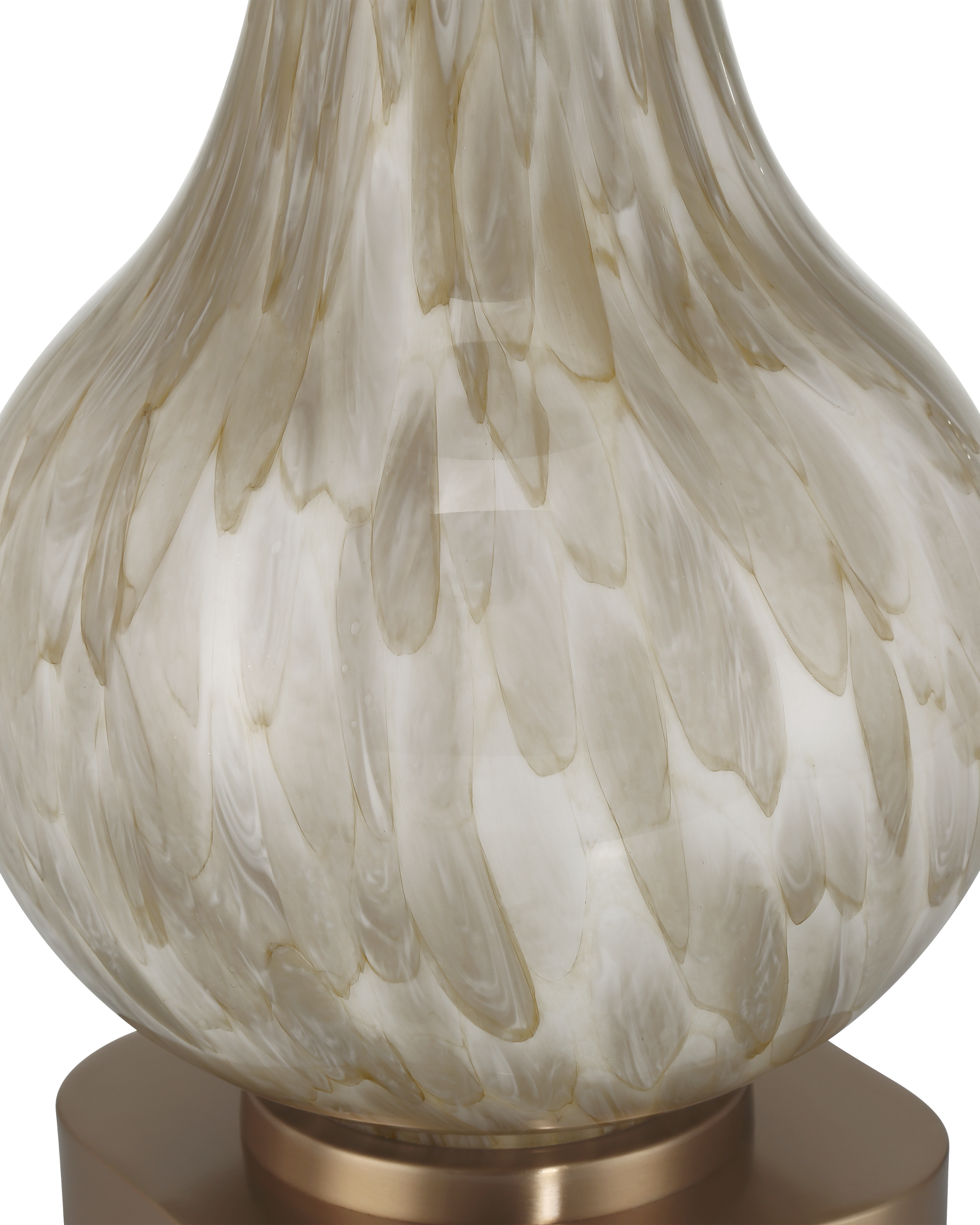 • The Bombon Table Lamp is a remarkable caramel-colored glass lamp that illustrates the artistry when fusing and marbling techniques are combined, as the marbling creates the patterns that seem to float on the surface to bring it a sense of movement. The paleness of the glass is contrasted by the warmth of the stacked metal base and round finial in an antique brass finish. Because this lamp is created using a highly artisanal process, slight variations will occur.