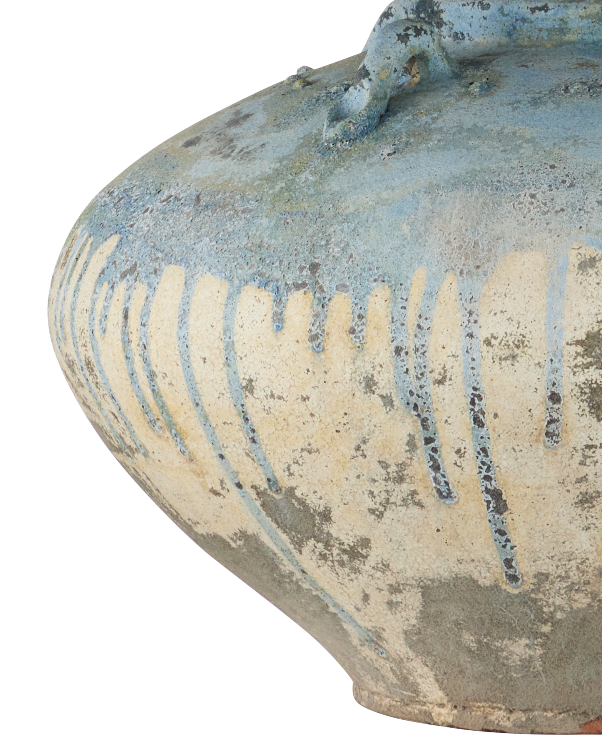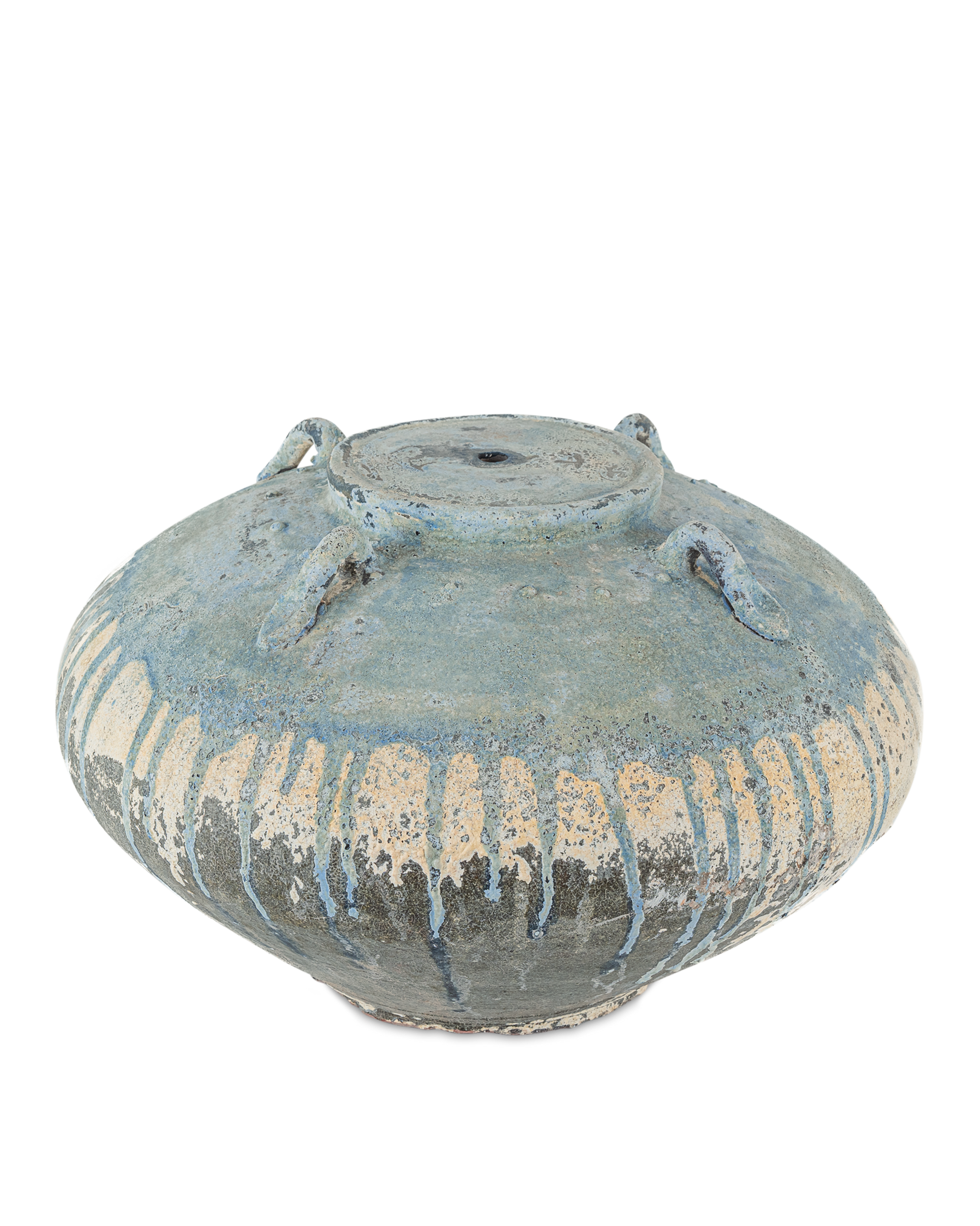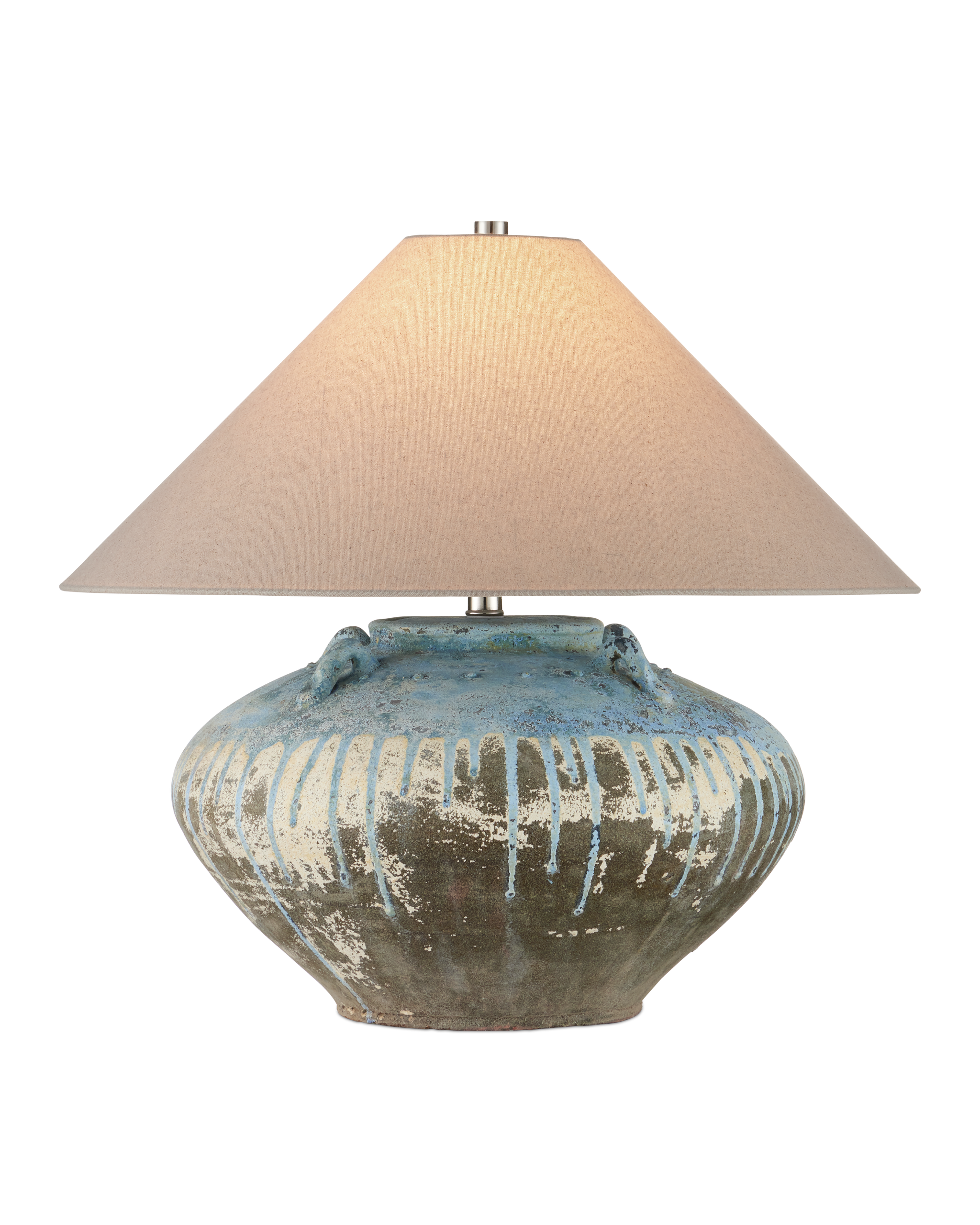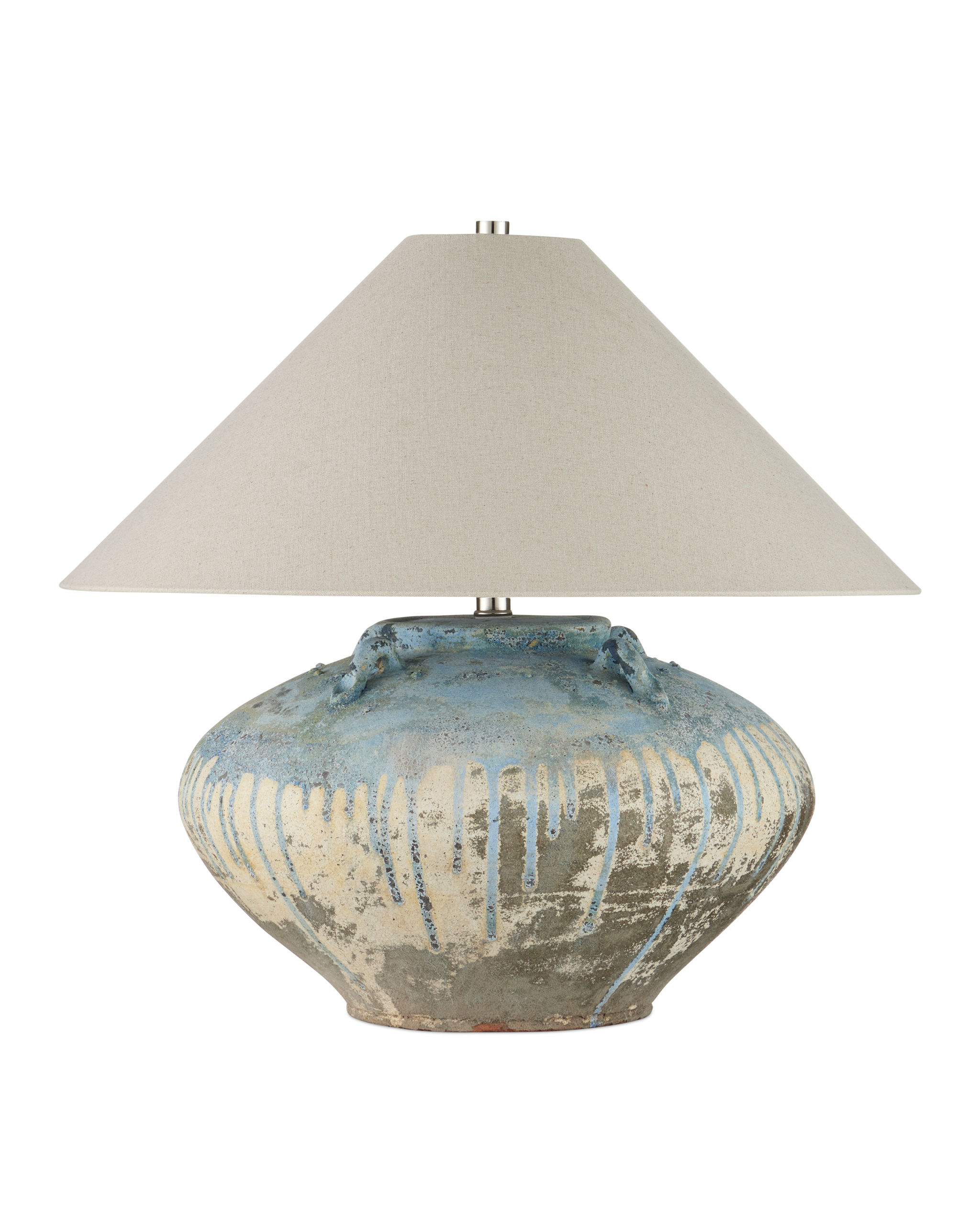 • Made of hand-built terracotta, the Catania Antique Blue Drip Table Lamp has tremendous Mediterranean personality. Because the pale ivory color is slathered on by hand and the blue is dripped by an artisan, each color that contrasts the hues of the raw terracotta will bring significant variations to each lamp. With an appearance that looks centuries old, the sizeable jar-shaped body, which measures two feet in diameter, is contrasted by the flaring modern empire shade.