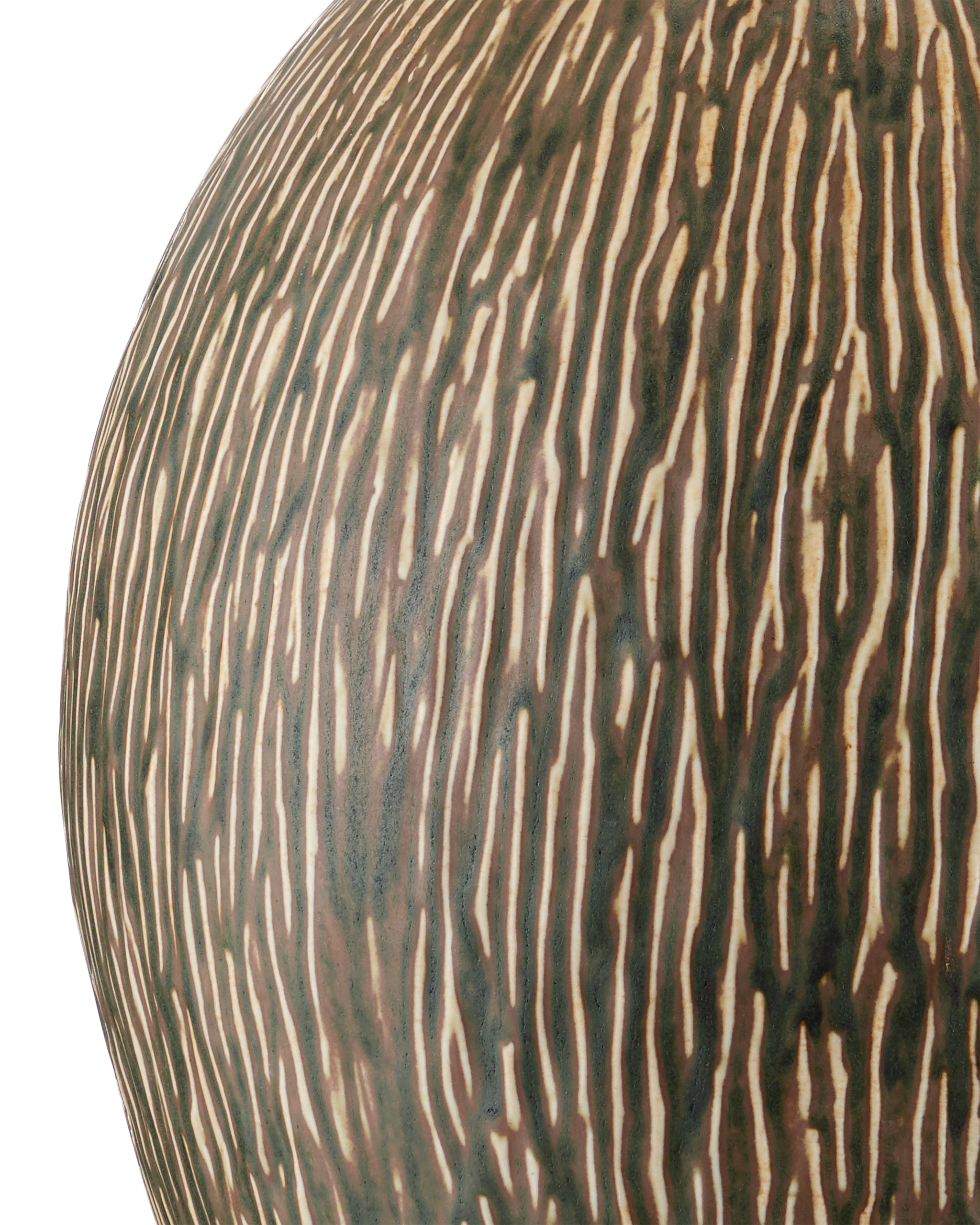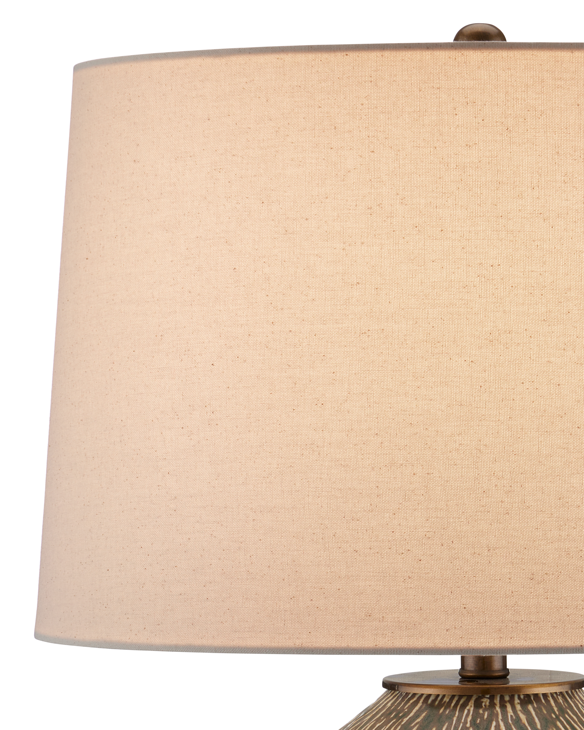 • The Hildreth Table Lamp is awash in a textural pattern in an olive green and beige color combination. Made of porcelain, the dark green lamp gains a sense of movement from the flowing lines that ornament its surface. The fact it culminates without a base, and has an antique brass finish on the hardware and finial brings this composition great warmth.