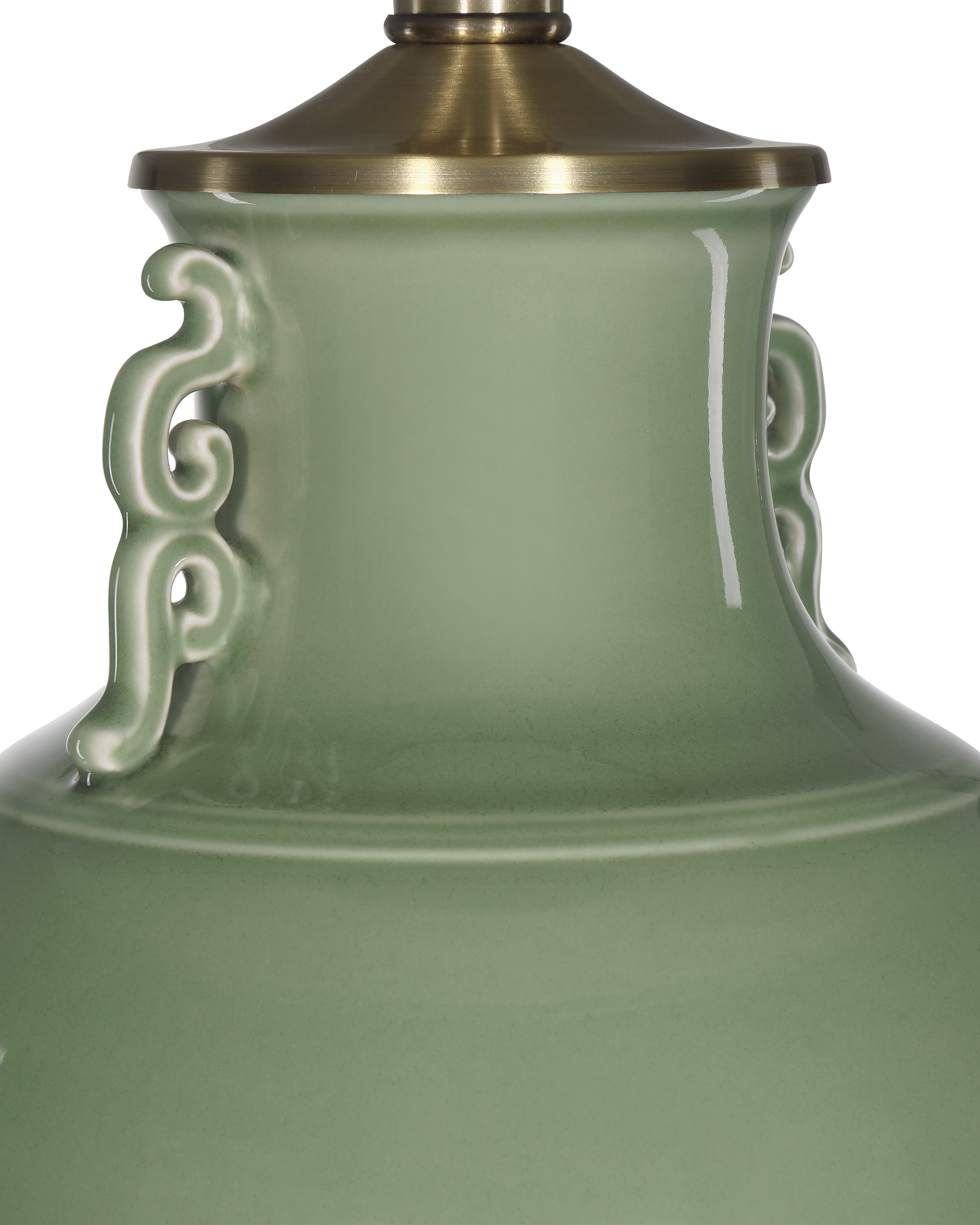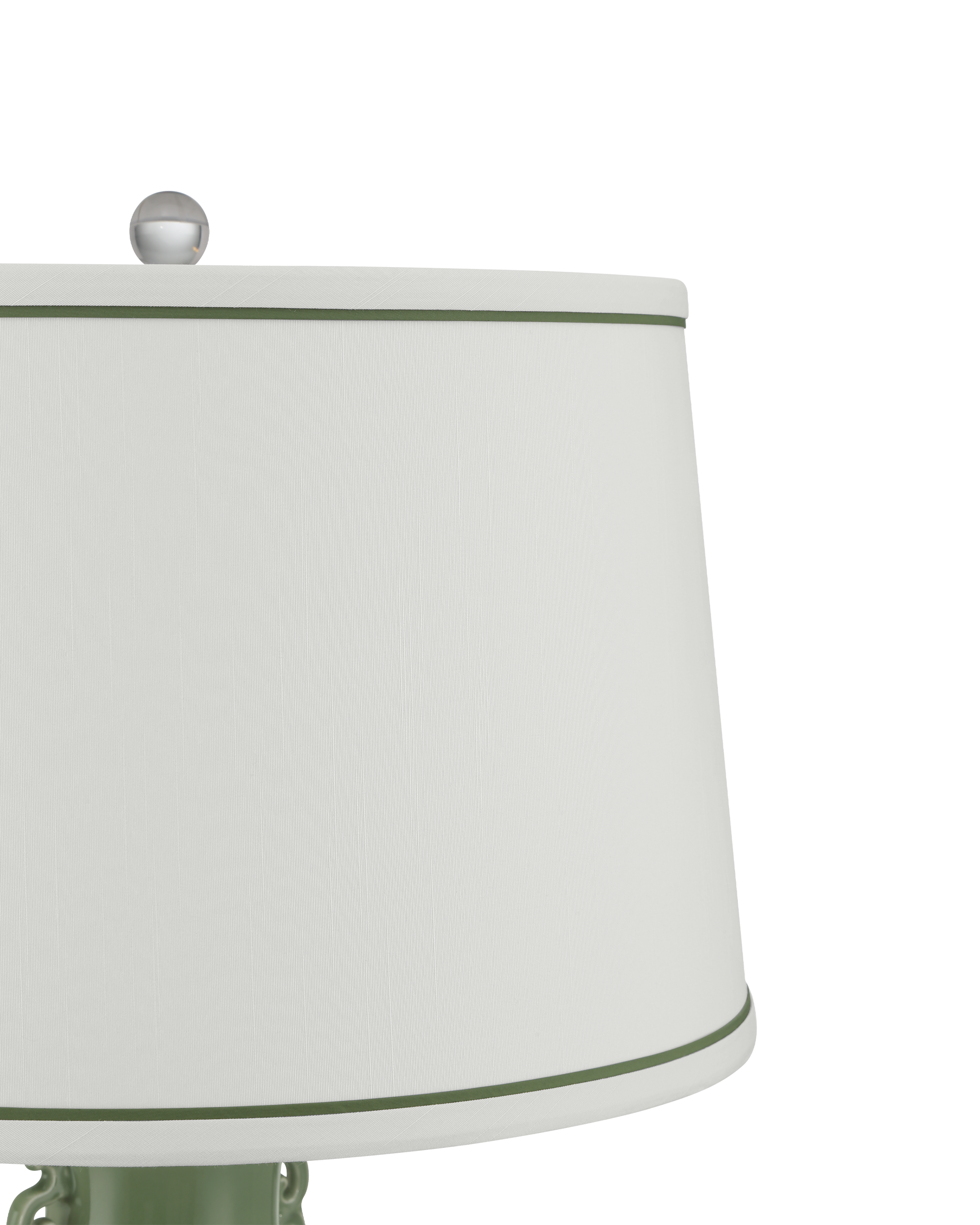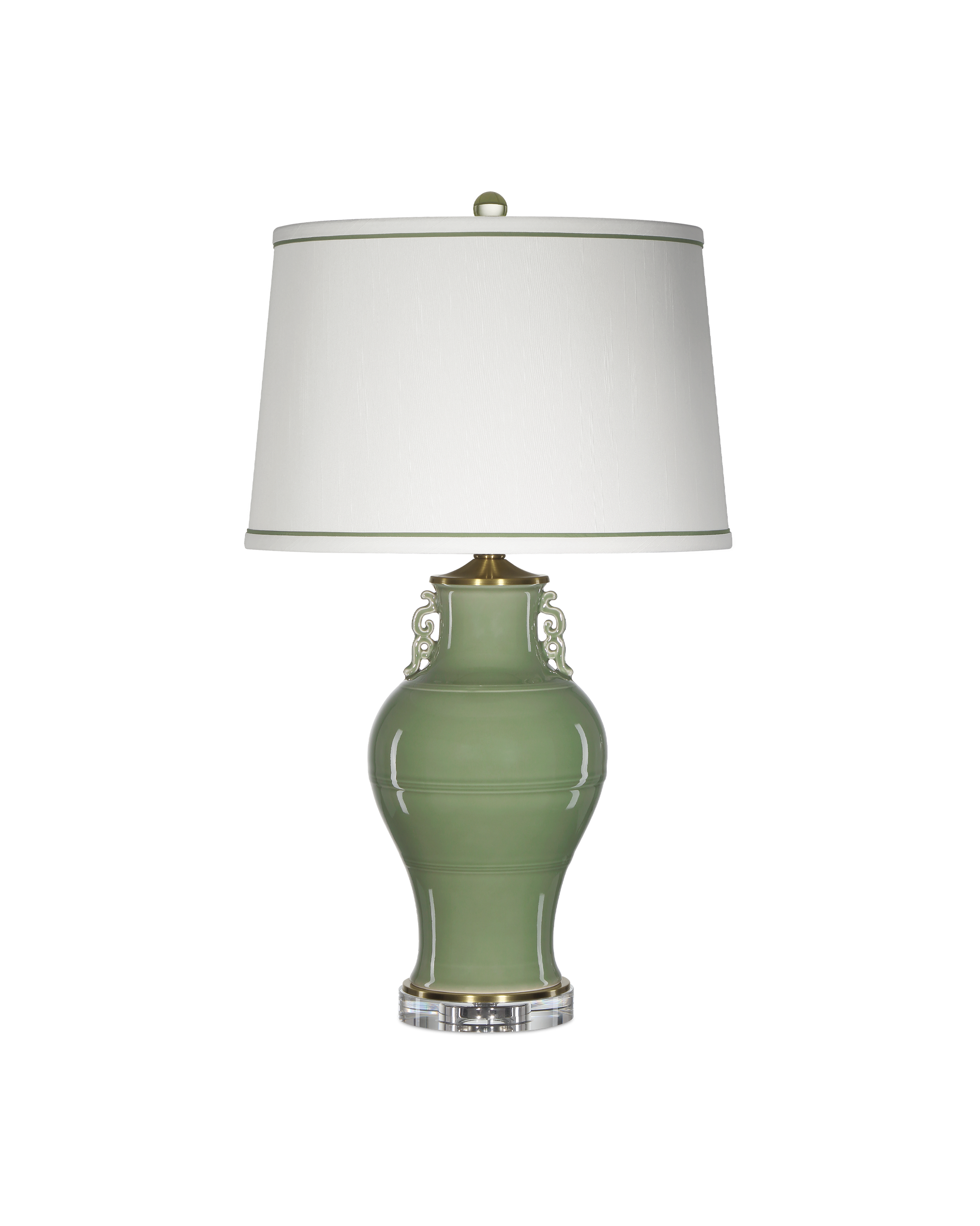 • The baluster shape and Ming-Dynasty ornamentations on the Londonderry Green Table Lamp bring it a classic Chinoiserie feel that is echoed by the double-trimmed shade. The porcelain body is a luminous sage green color that reflects its timeless style. An antique brass riser between the optic crystal base and the lamp’s body matches the cap that sits just below the shade. An optic crystal finial complements the base to bring cohesion to the design.