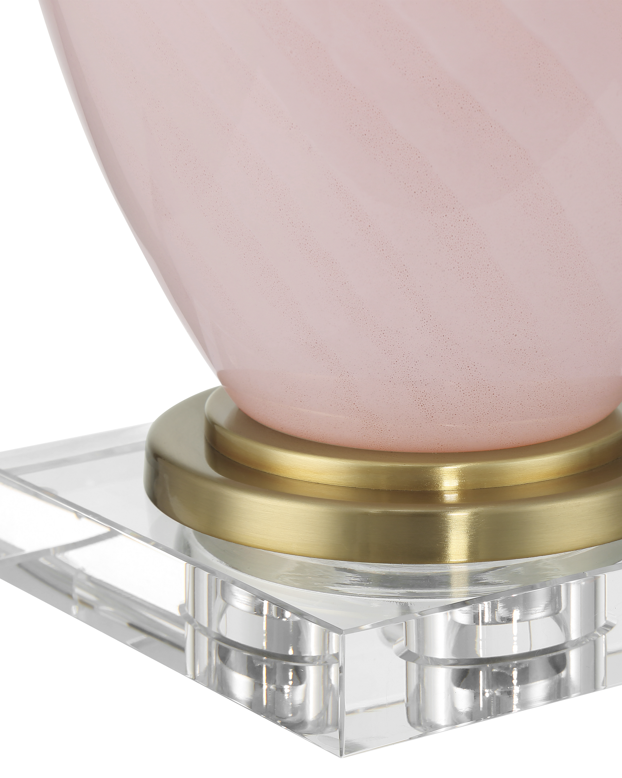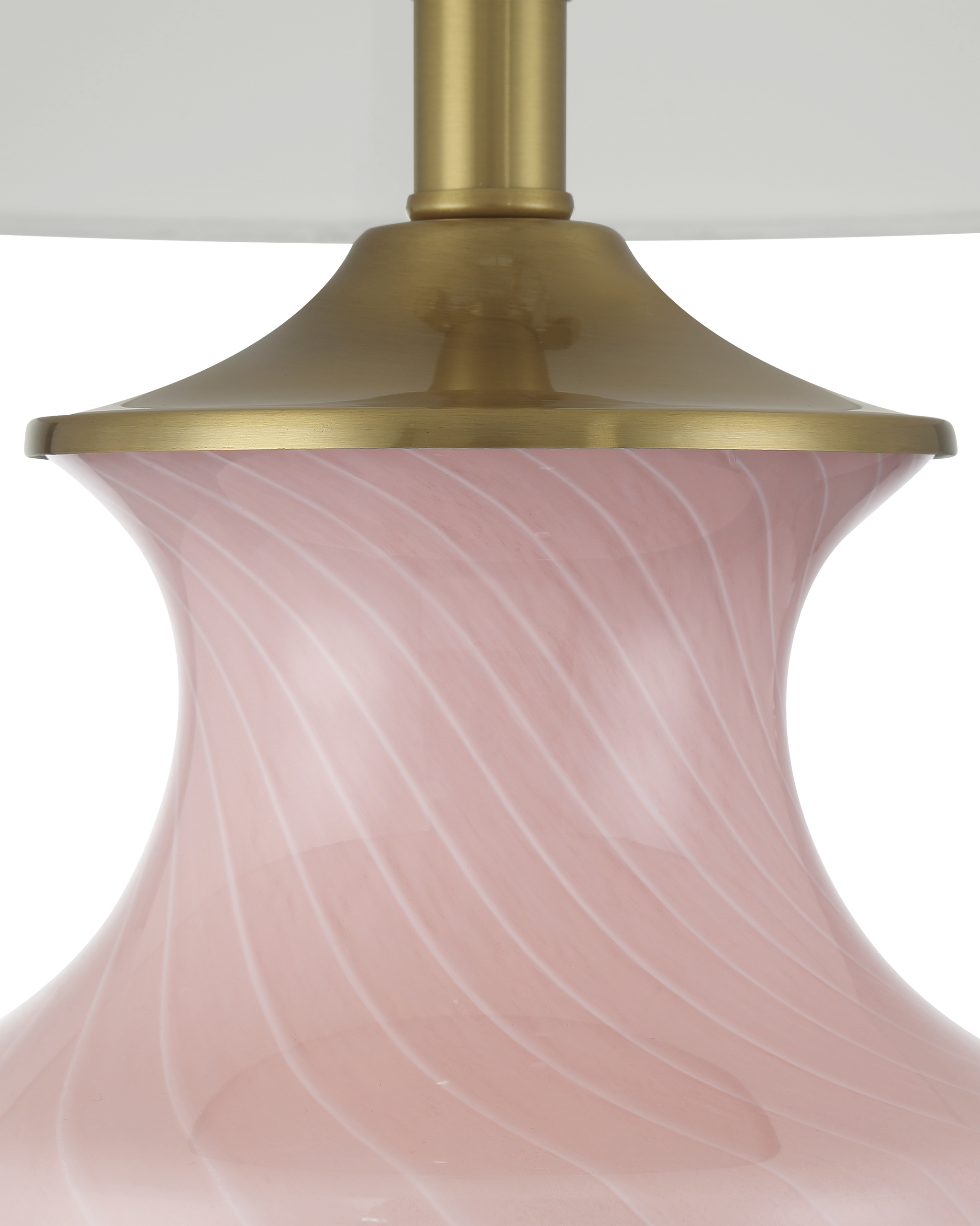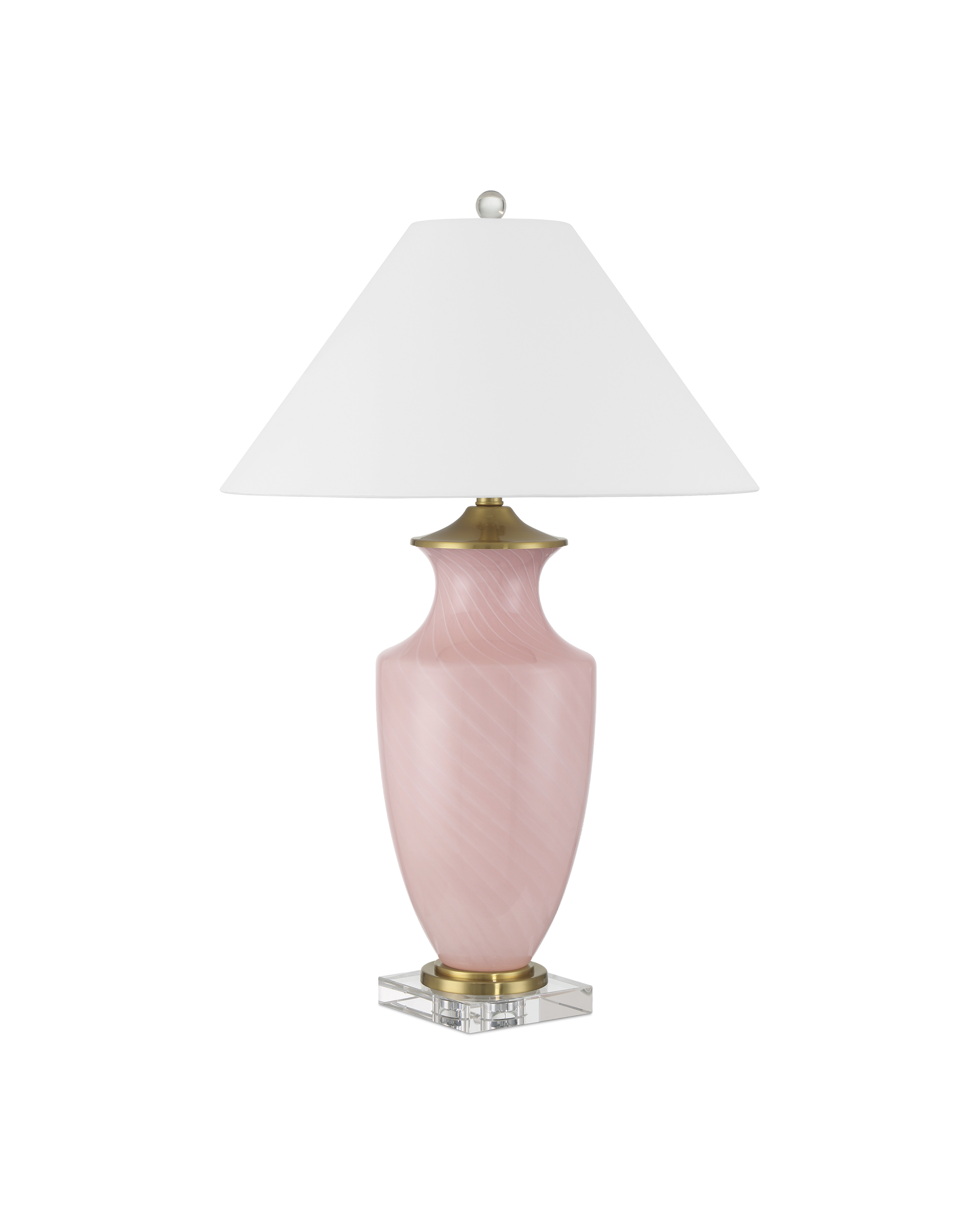 • The tone-on-tone pattern flowing along the surface of the baluster-shaped body of the Lucy Pink Table Lamp is made in the Venetian tradition of Zanfirico, which was perfected by Murano glassblowers in the nineteenth century. Rods of glass are heated until they fuse and then pulled to create the markings. The pink lamp is topped with an empire shade and there is a metal step above the optic crystal base in a polished brass finish.
